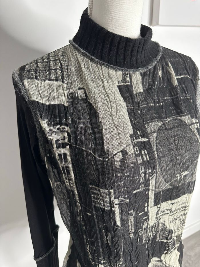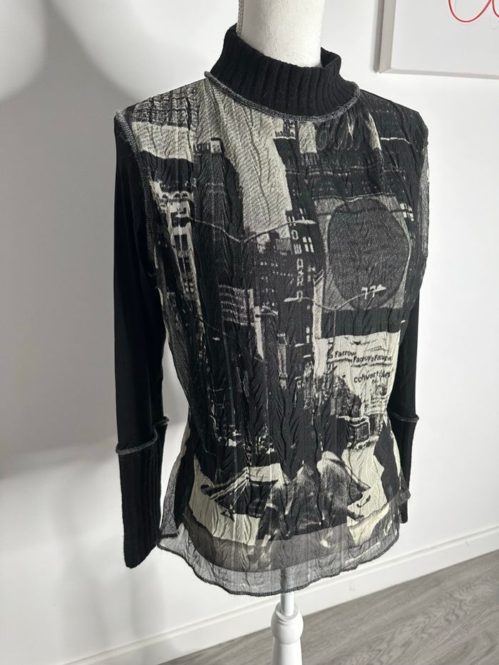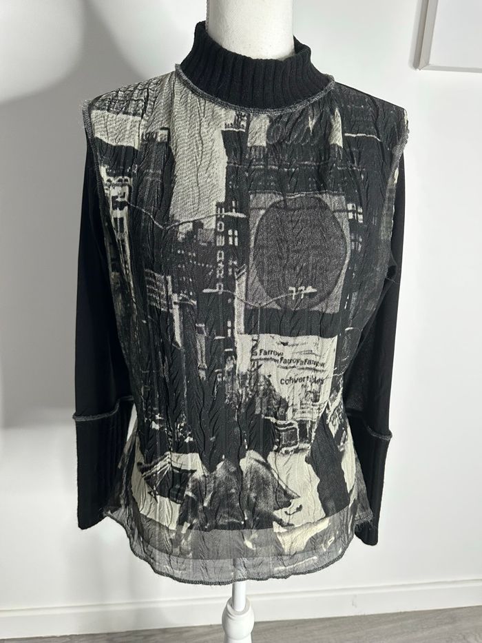Blouse pull - Excellent état - Taille 42 équivalent XL Dimensions en bas de l’annonce - Mesh et maille - Noir et beige crème - Style Y2K, années 2000’ - Imprimés ville, New York - Col et bas des manches en maille, le reste est en mesh - Polyamide, polyester, viscose, acrylique, élastane - Pas d’étiquette de taille Dimensions: - 50 à 60cm niveau aisselles - 60cm de long