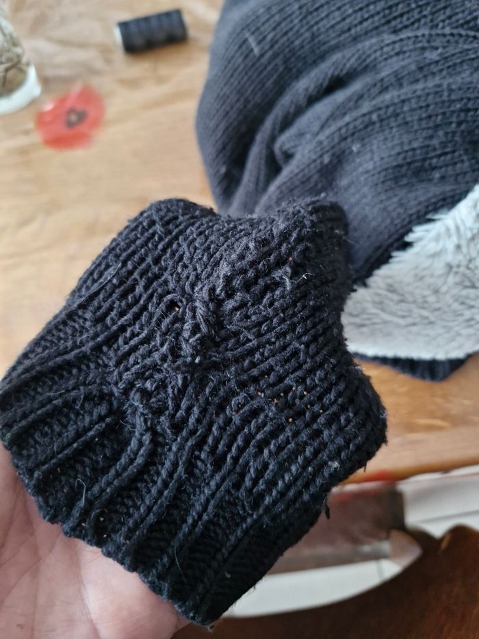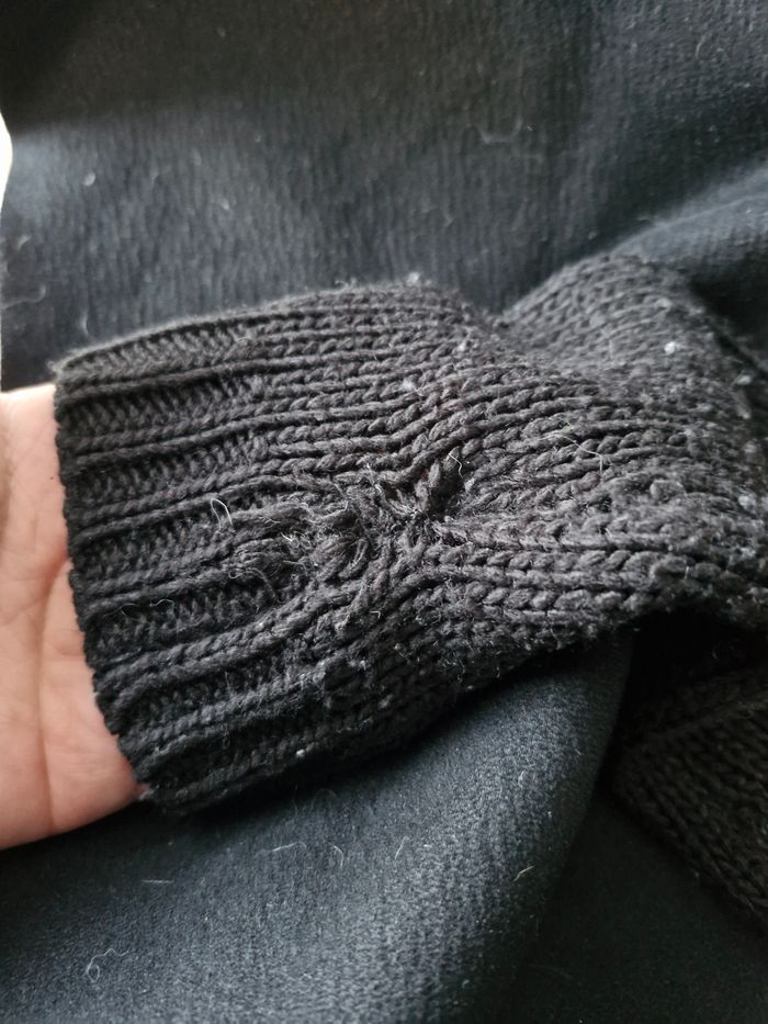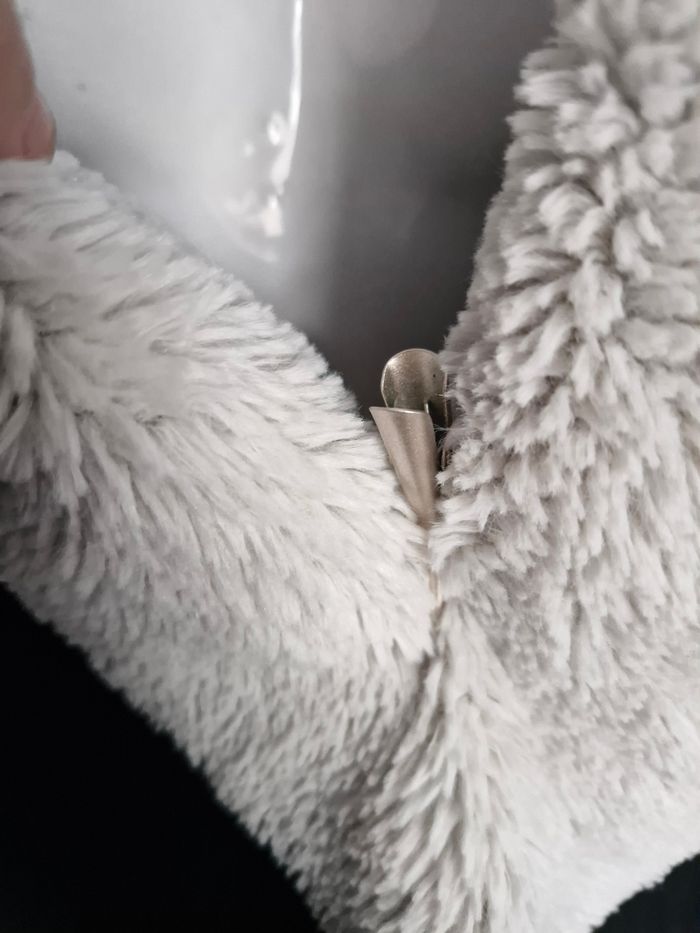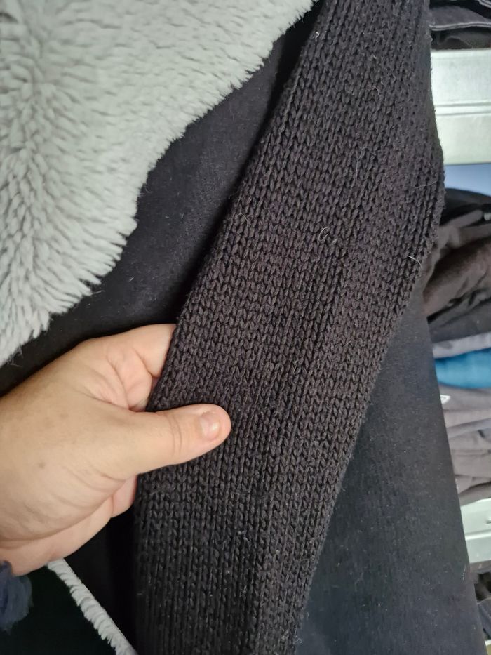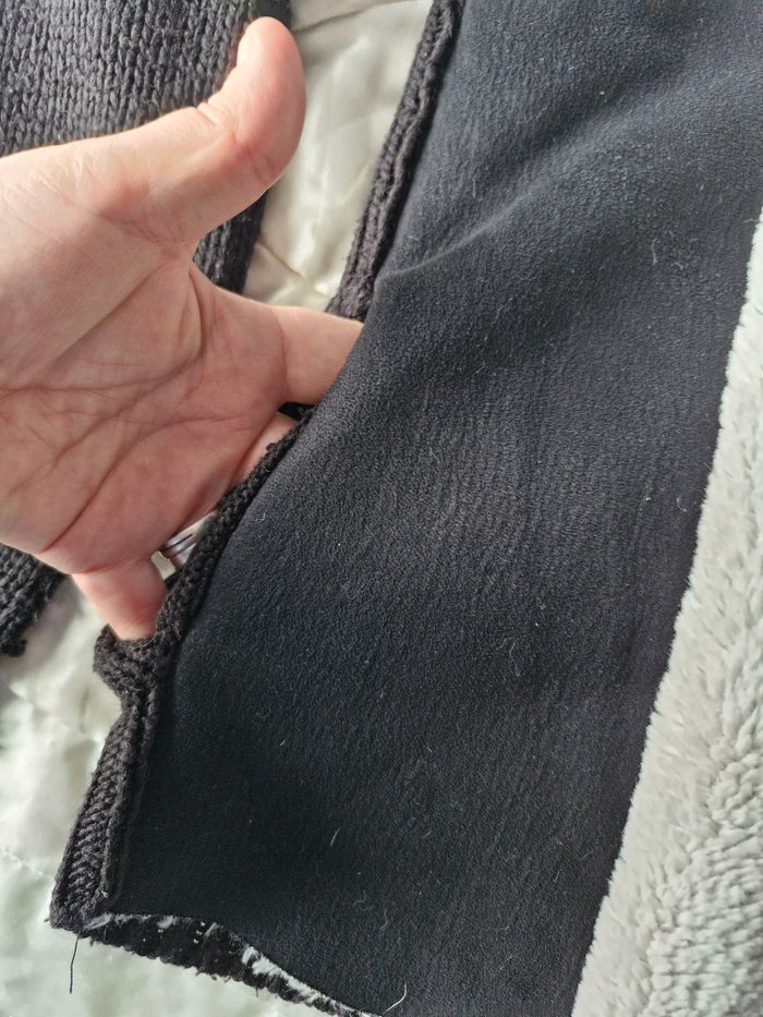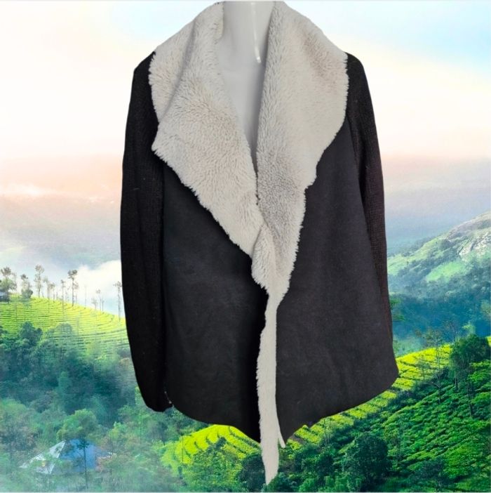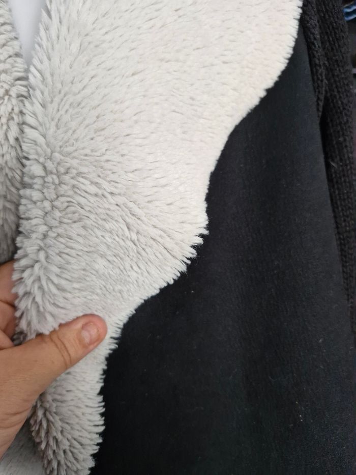 ⚕️Tri-matière sympa : tissu genre cuir mate (ou plutot croute de peau je dirai), laine pour le dos et les manches, et moumoutte pour le bord et le col haut.