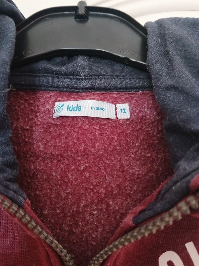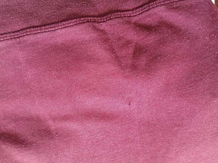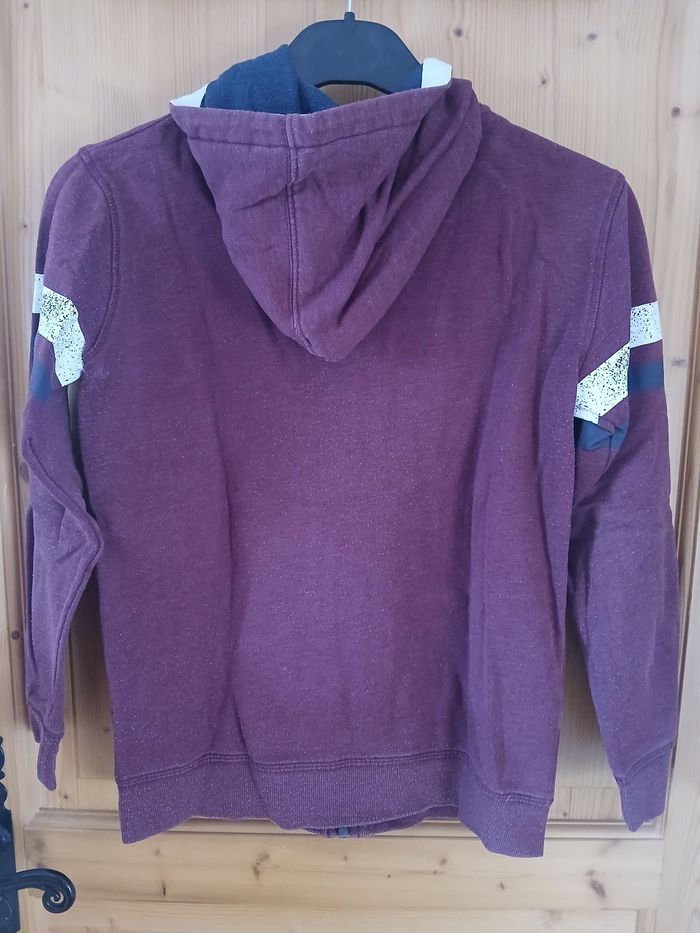 Sweat à capuche bordeaux avec 2 poches et une petite impression sur le devant 1 petit trou derrière (dernière photo)