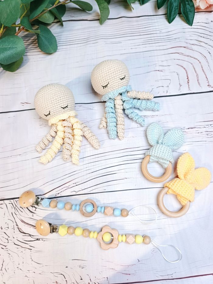 Coffret bébé fait main Idéal cadeau naissance, petit coffret pour bébé comprenant une pieuvre en coton Oeko tex, une attache tétine en bois naturel non traité et silicone alimentaire et un hochet. Ce coffret est réalisable dans différents coloris Les articles de ce coffrets peuvent également être vendus à l'unité. N'hésitez pas à me contacter pour plus d'informations 😉