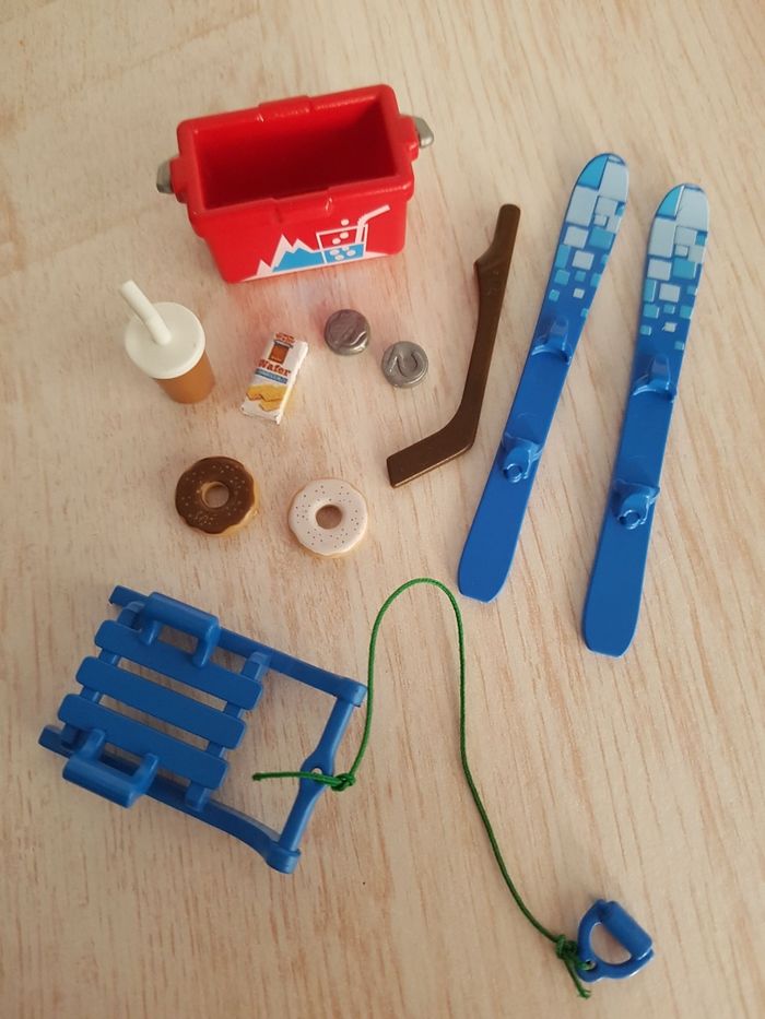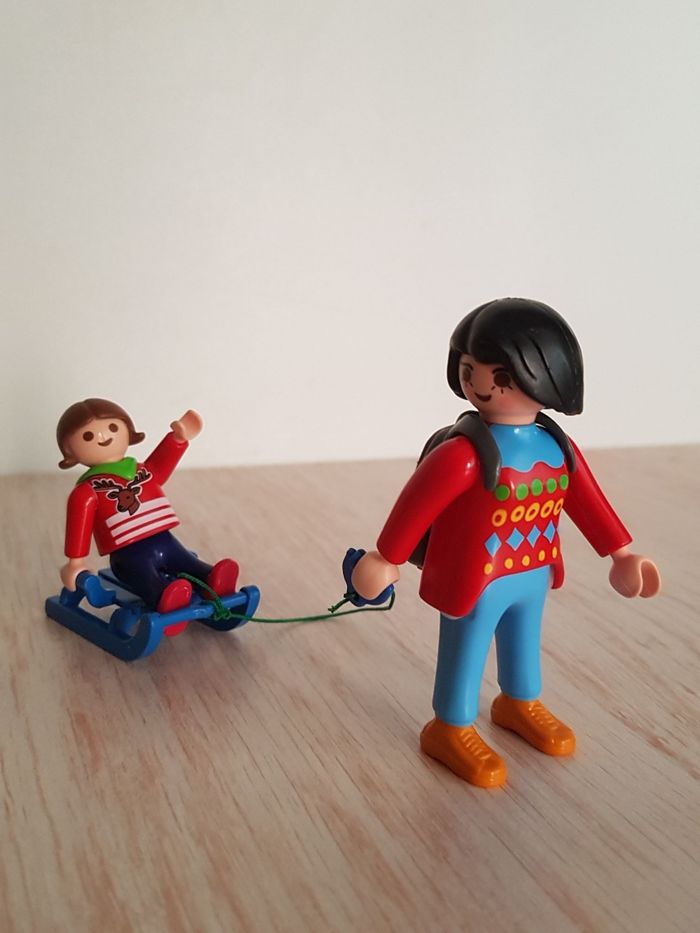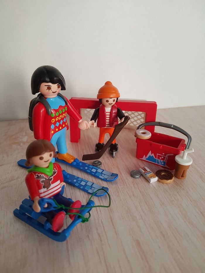 Lot de playmobil sur le thème de l'hiver, la neige, les vacances de Noël à la montagne ou aux sports d'hiver • 3 figurines : maman, garçon et fille • Petits accessoires : but de hockey sur glace, crosse, patins à glace pour enfant, panier, beignet, gâteau, boisson, ski pour adulte, luge