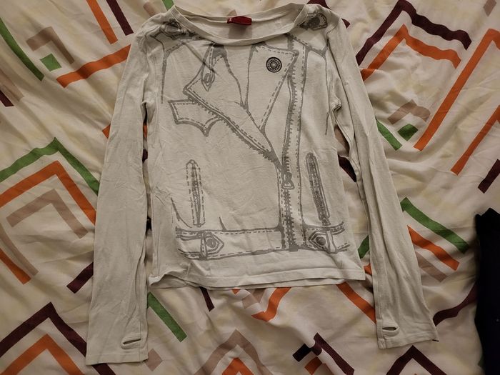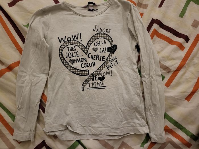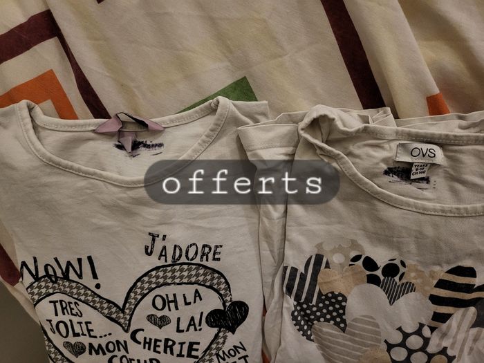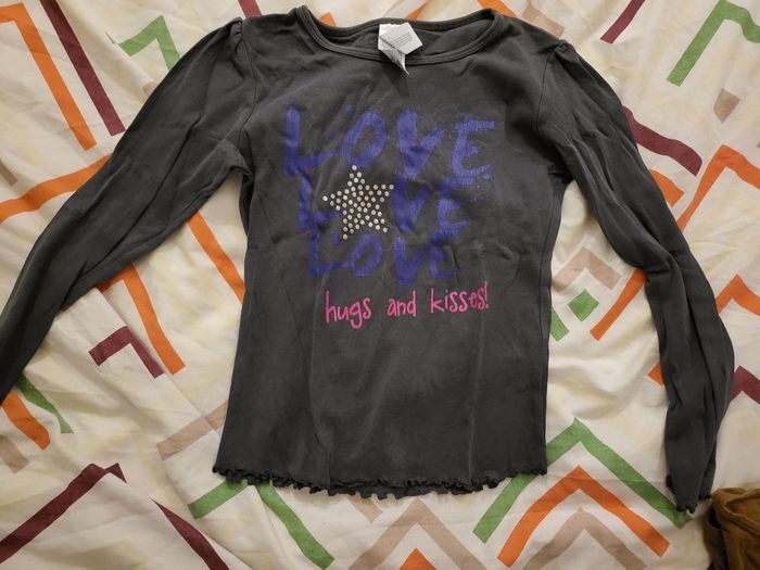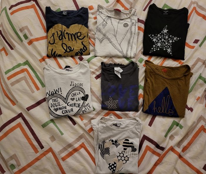 Lot de 7 tee-shirts manches longues - 1 Levi's 10 ans - 1 bleu marine texte "J'aime le week-end" Zara kids 9-10 ans - 1 noir motif étoile Kiabi 10 ans - 1 marron texte "Hello Mountain" - 1 avec texte "Love Love Love hugs and kisses" bon ton 10 ans - 2 blanc OVS 9-10 ans offerts dans le lot car ils ont été tamponnés au nom de ma fille pour son séjour en colonie et il reste donc les traces de ces tampons
