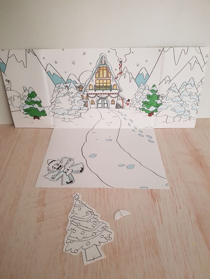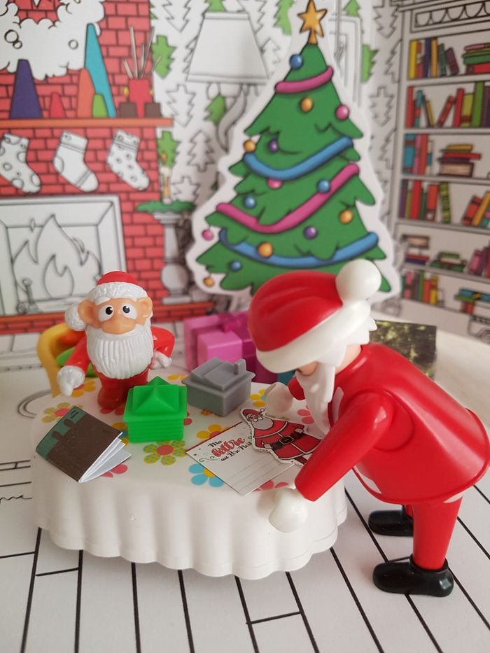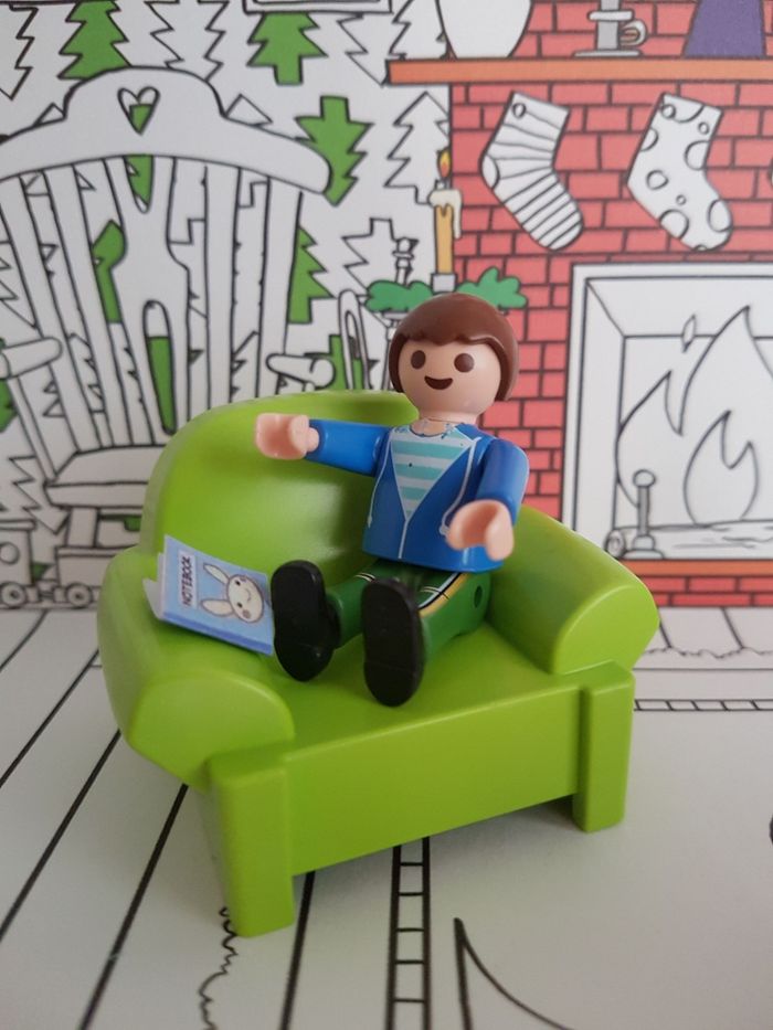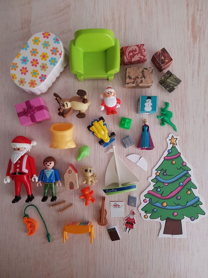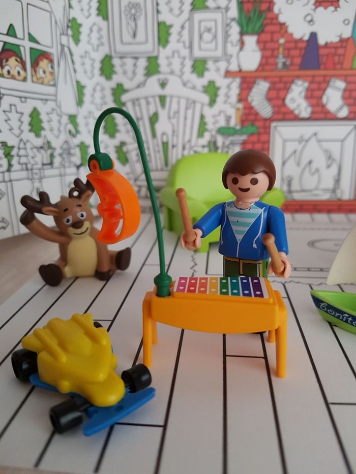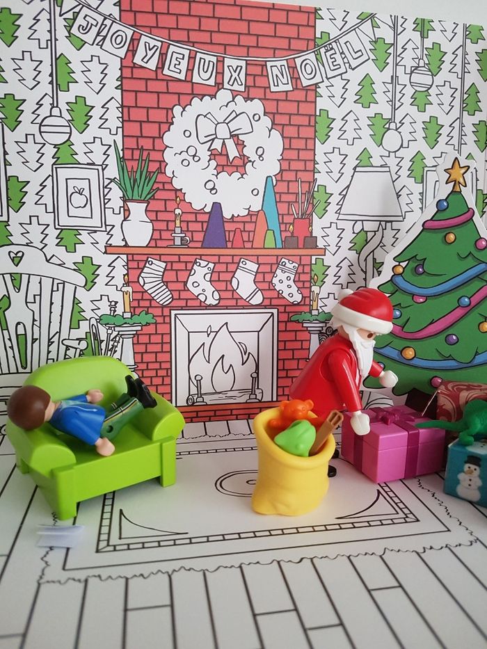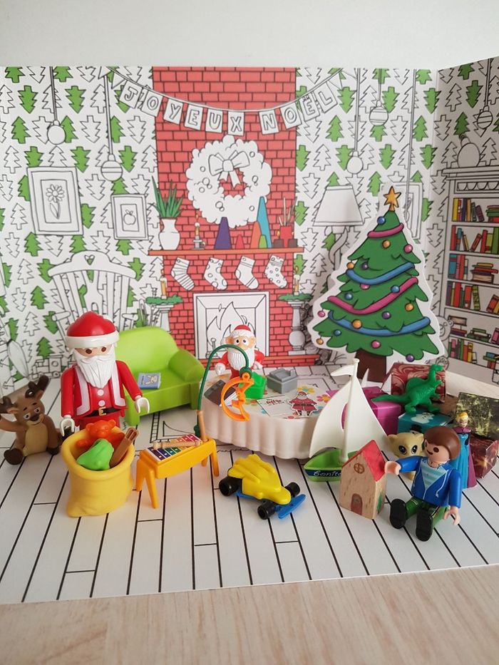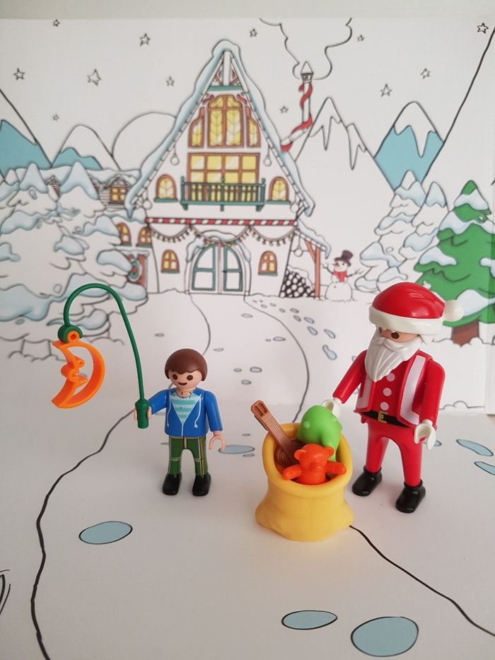Lot de playmobil Christmas sur le thème de Noël. La nuit de Noël, le garçon attend la venue du papa Noël allongé dans le fauteuil. Le père-noël arrive avec sa hotte remplie de cadeaux (jouets, voilier et ours en peluche) Tenue traditionnelle de Santa claus avec bonnet rouge et barbe blanche 2 figurines : père noël et enfant garçon Petits accessoires : canapé, table, hotte, xylophone (instrument de musique), guitare, bateau à voile, animal en peluche, cadeau à remplir, lanterne ... Décor en carton : sapin de Noël ( verso à colorier), intérieur de la maison ou extérieur en montagne avec neige