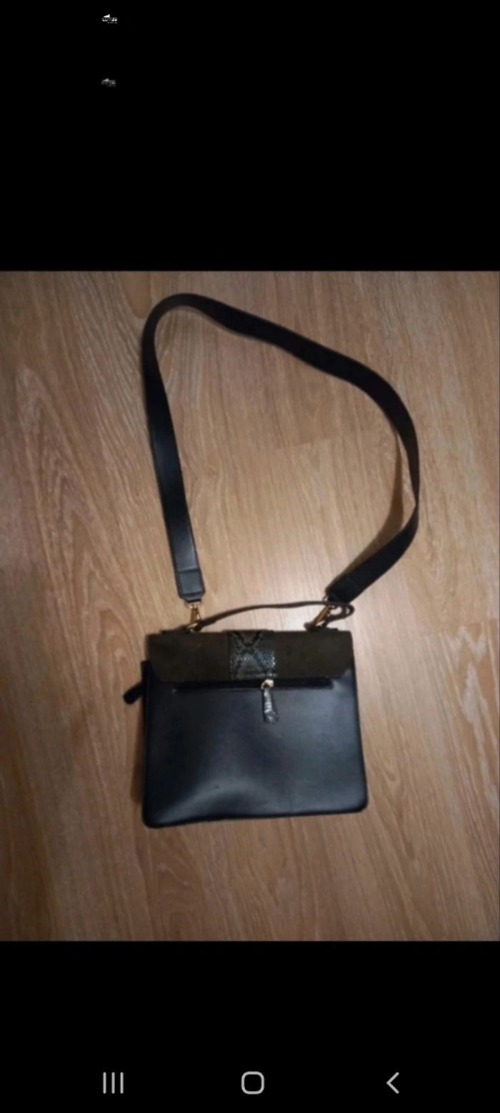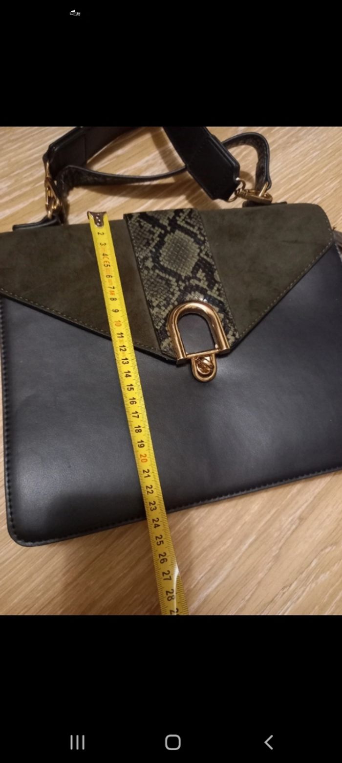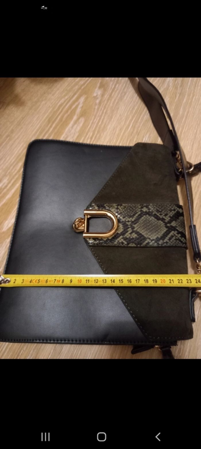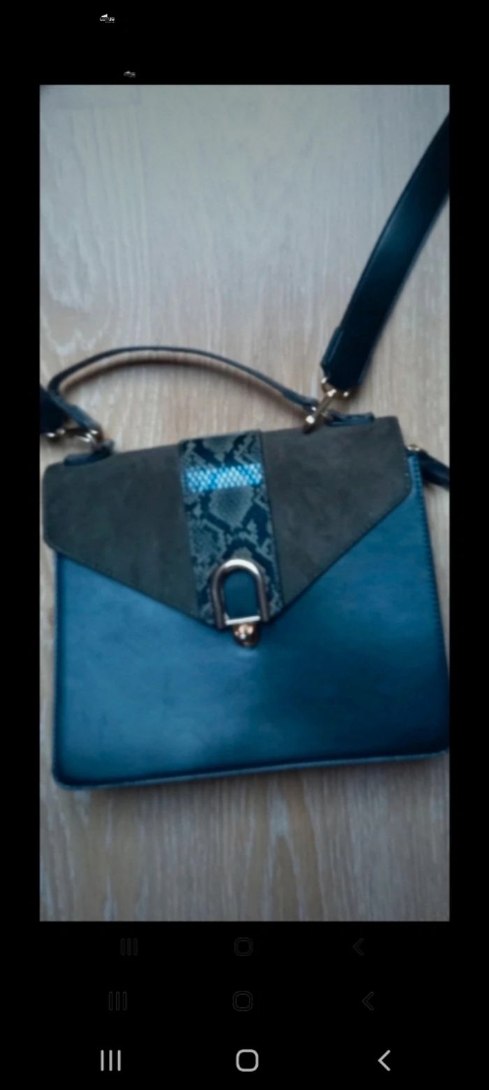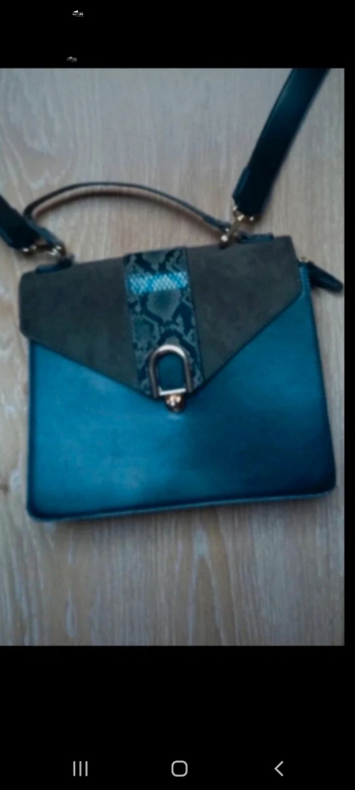 Sac Bata bleu marine détail python kaki à porter en bandoulière amovible ou avec l'anse. Neuf. Jamais utilisé. Dimensions : 28 de hauteur par 23 cm de largeur (photo). Il y a deux petits compartiments (photo) et une autre petite poche zippée (photo).