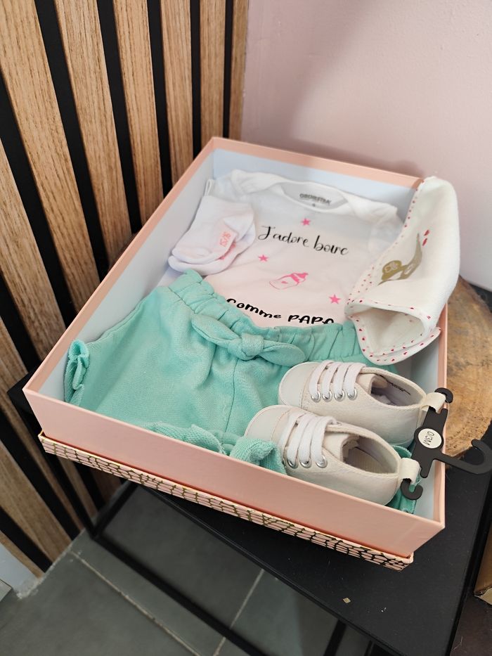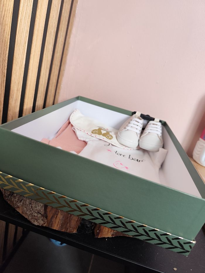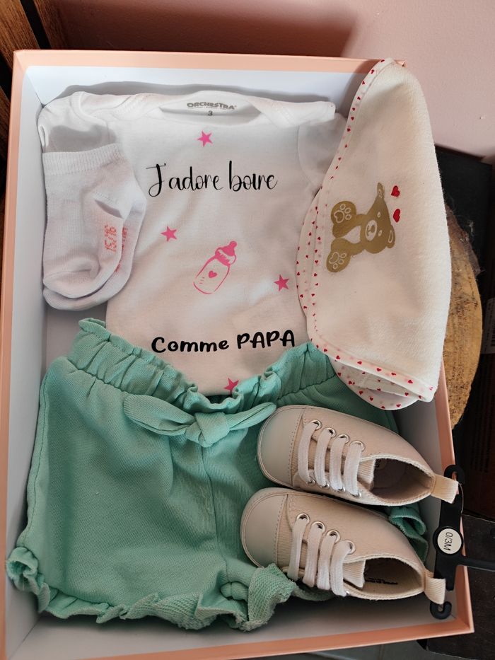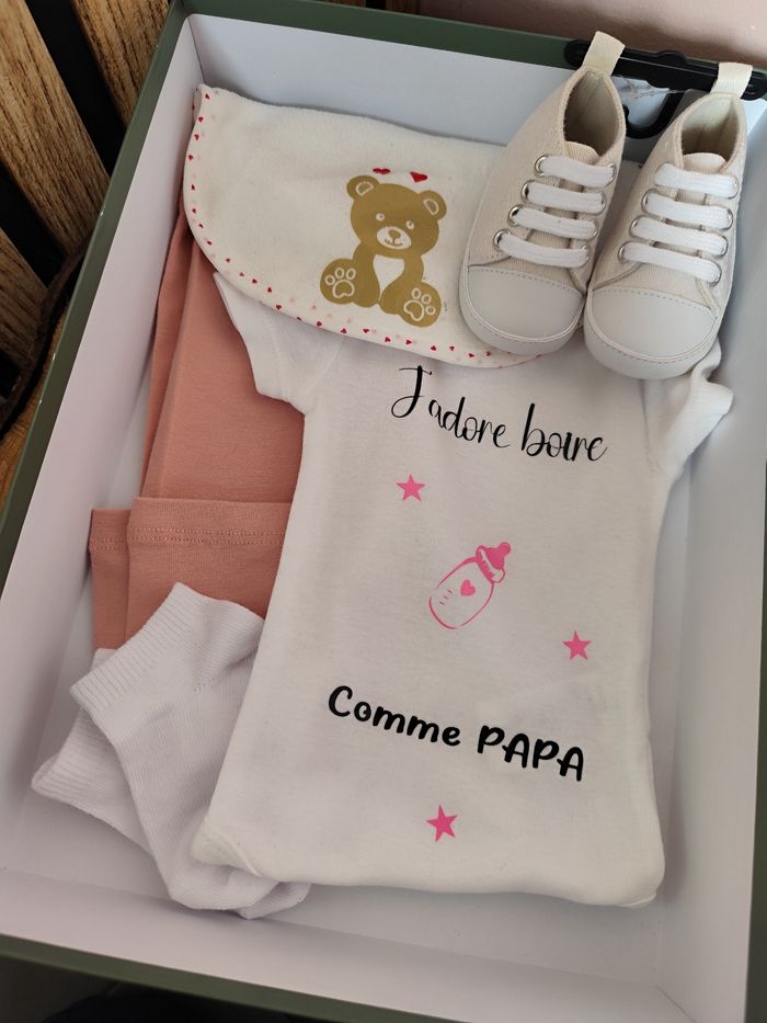 Je vous propose divers coffrets personnalisés partiellement ou en totalité. N'hésitez pas à me contacter pour me faire votre demande : Bodys personnalisé à partir de 7€ Chaussettes personnalisé à partir de 3€ .... -> n'hésitez pas à m'écrire pour vous montrer tout ce que je propose -> d'autre boîte/coffret disponible