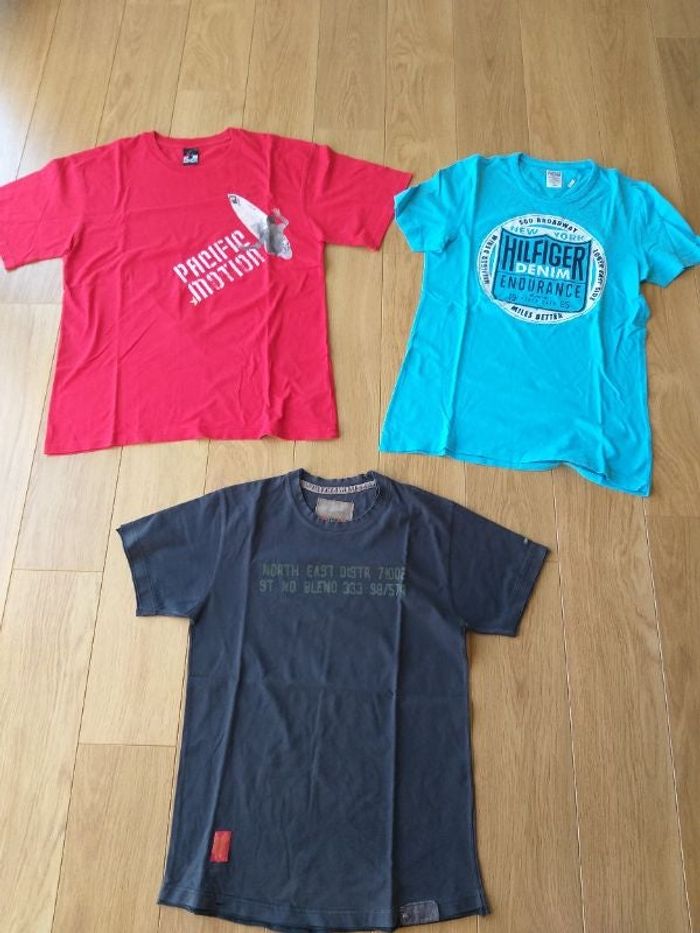 Vends lot de 3 tee-shirts à manches courtes en taille M. Ils ont été portés plusieurs fois (excepté le rouge). Le noir est un peu passé. Différentes marques. N'hésitez pas à me contacter si vous désirez d'autres photos ou renseignements.