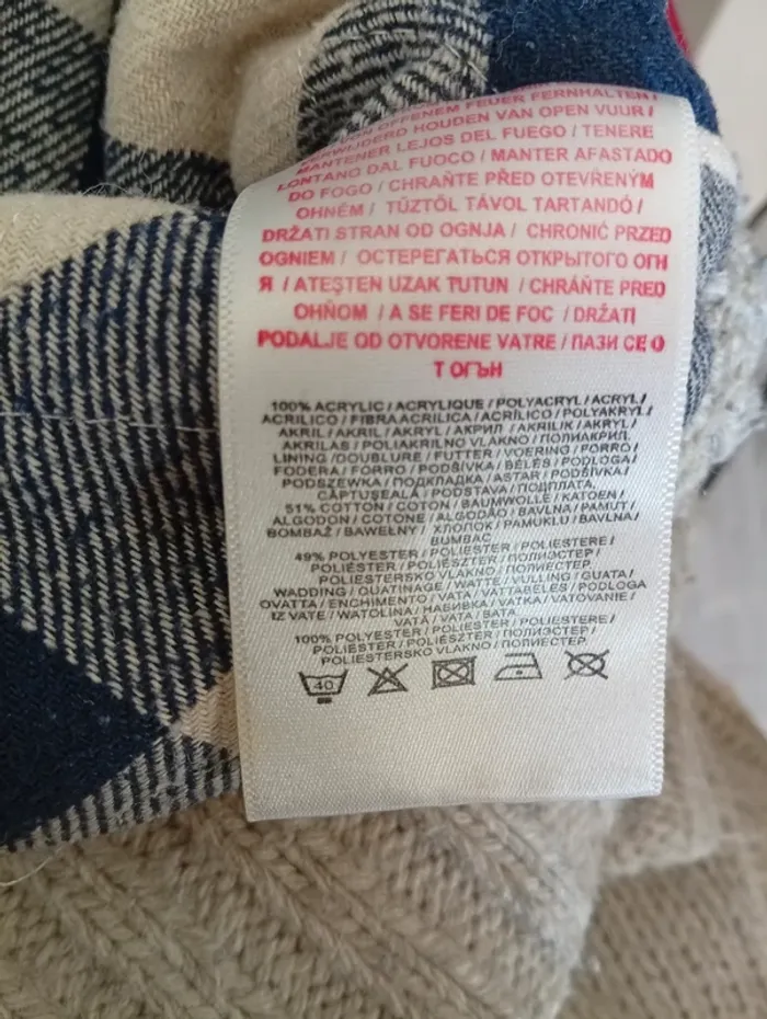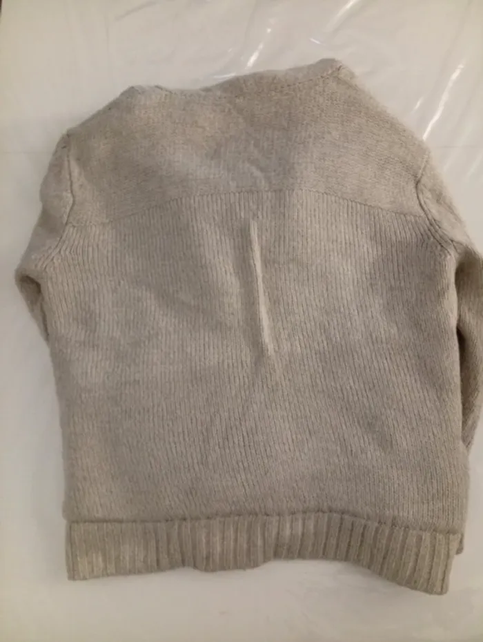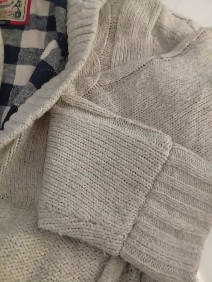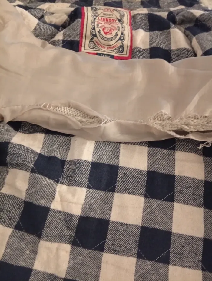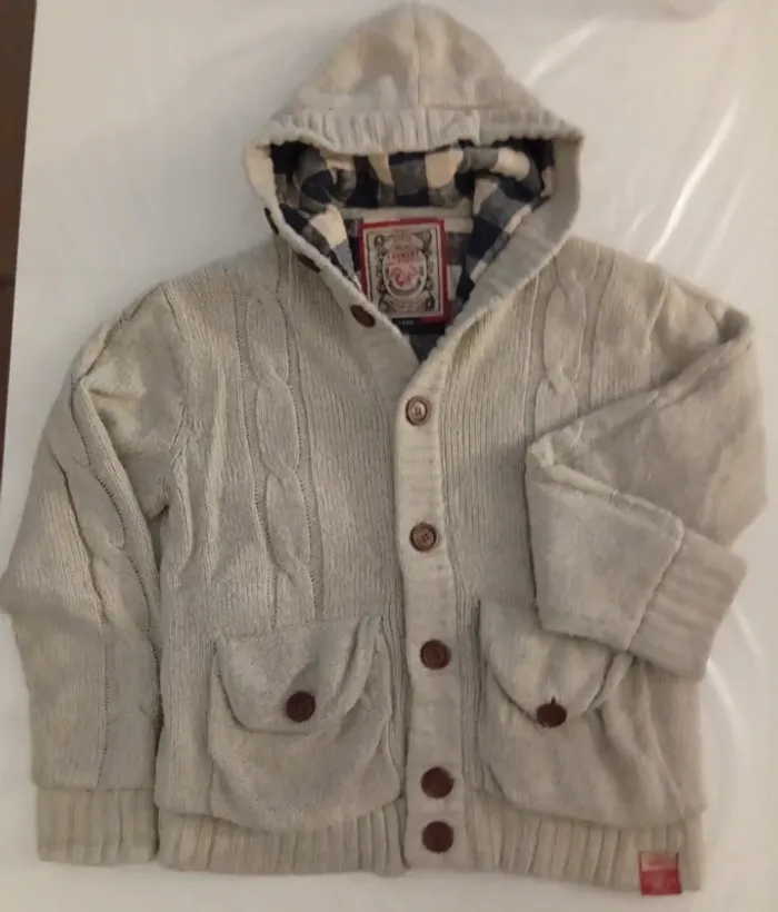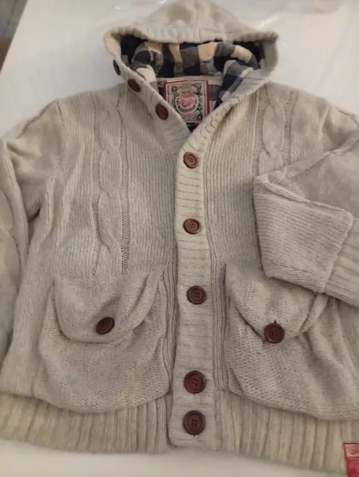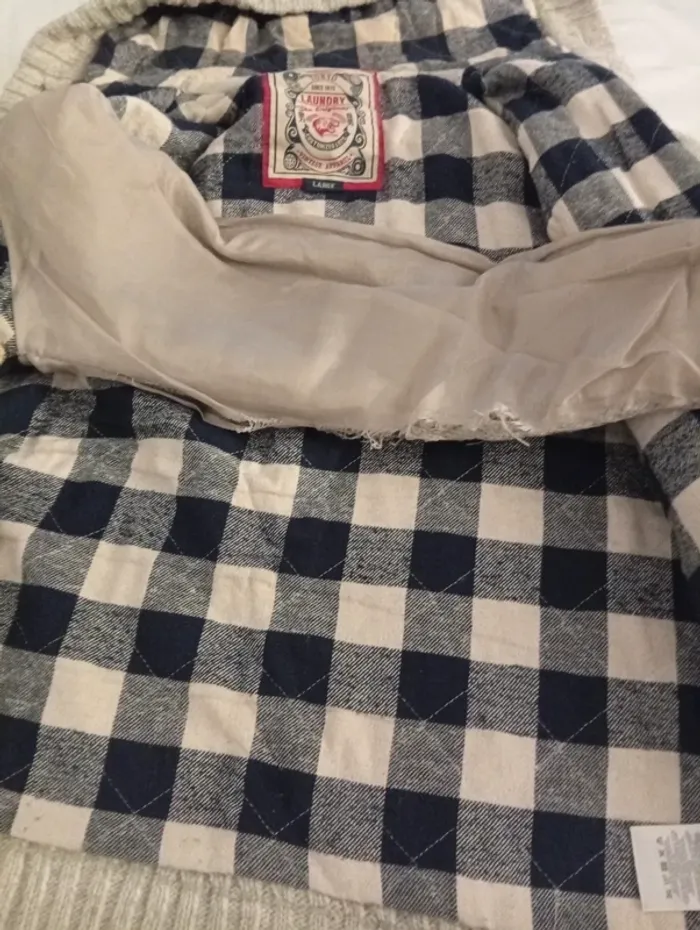 Veste homme style tricot, taille L de la marque Tokyo Laundry, présente quelques bouloches et la doublure du bras gauche est décousu voir photo. La veste reste utilisable .les bras ne sont pas doublé par rapport au corps qui lui est un peu plus épais .