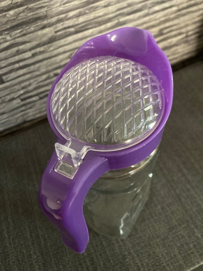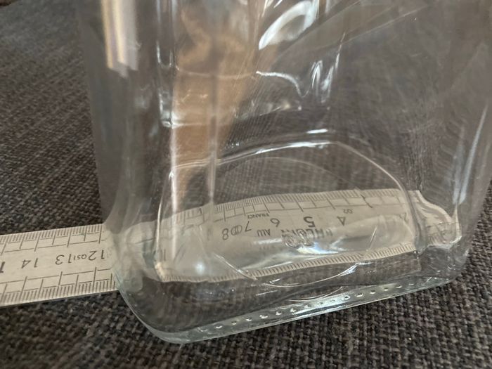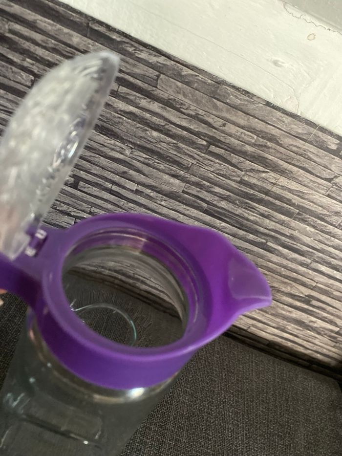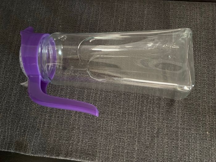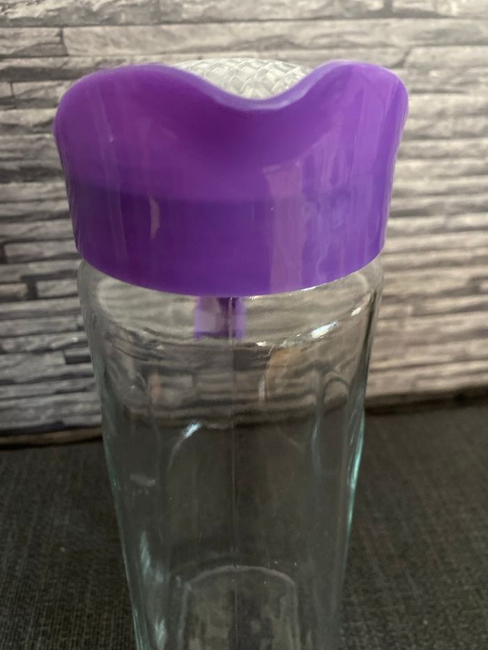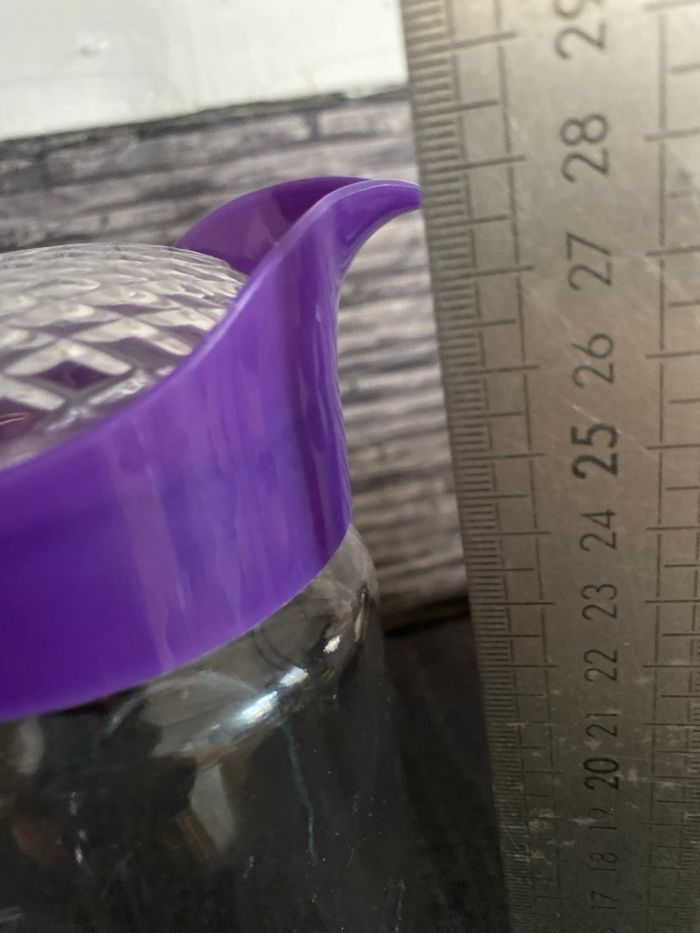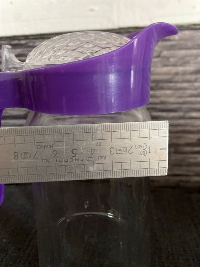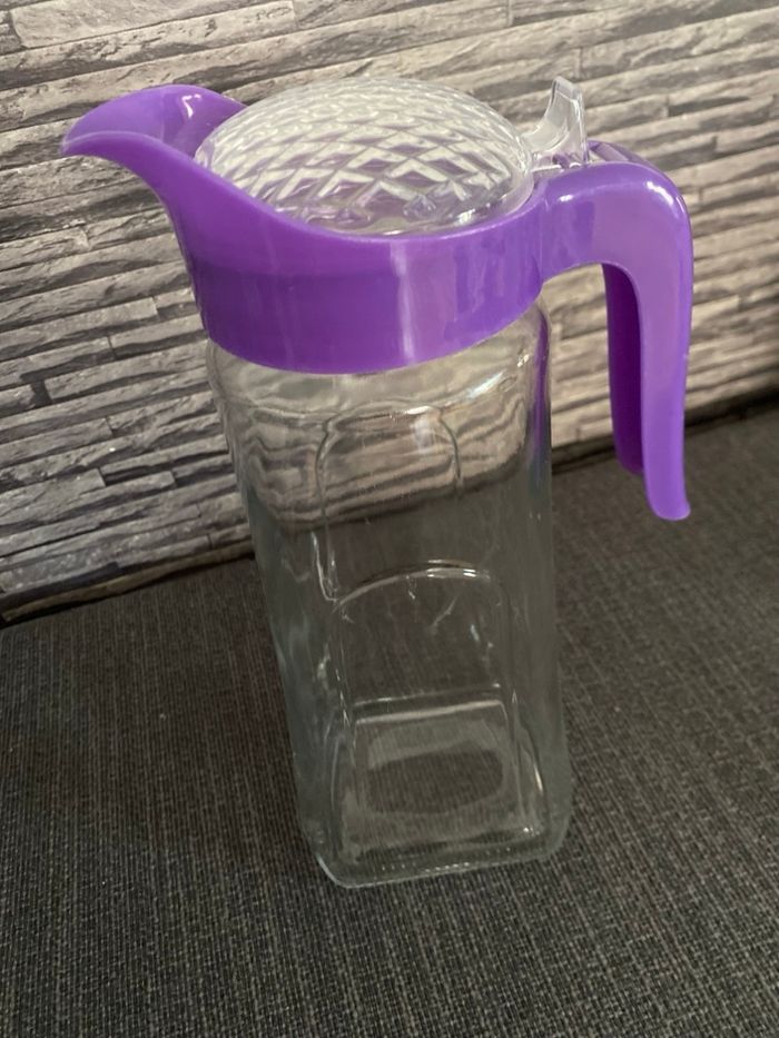 Très jolie carafe en parfait état En verre et plastique Poignée et couvercle Plus large en bas ( 11,5 cm) qu'en haut (9 cm) Hauteur au plus haut au bec verseur 27,5 cm