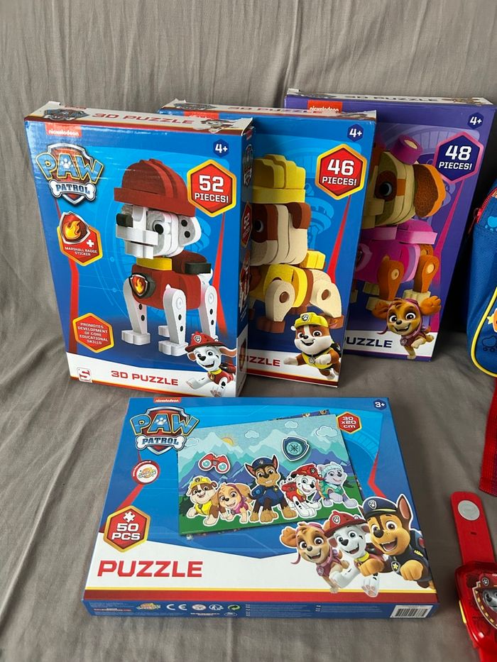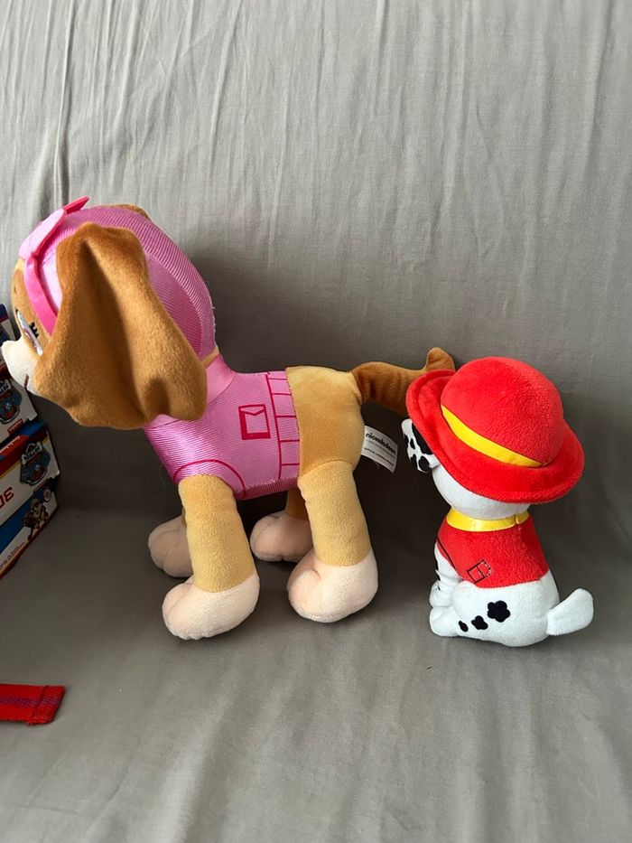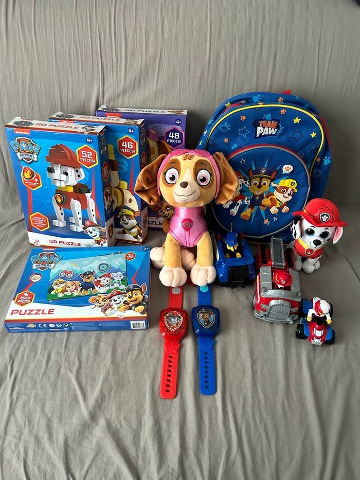 Lot de jouets pat patrouille 2 peluches (Stella et Marcus), 3 véhicules (Marcus Chase et Rider), 2 montres Vtech (parfait état, vendu avec piles), 4 puzzles (complets, 3 en 3D et 1 classique) et 1 sac à dos (légèrement abîmé bouloches) Prix du lot en magasin + de 90€
