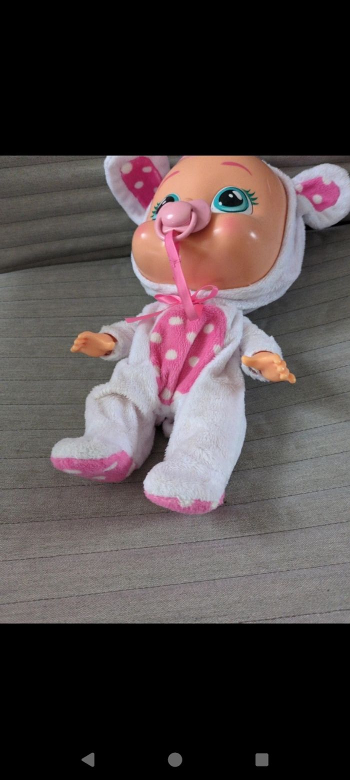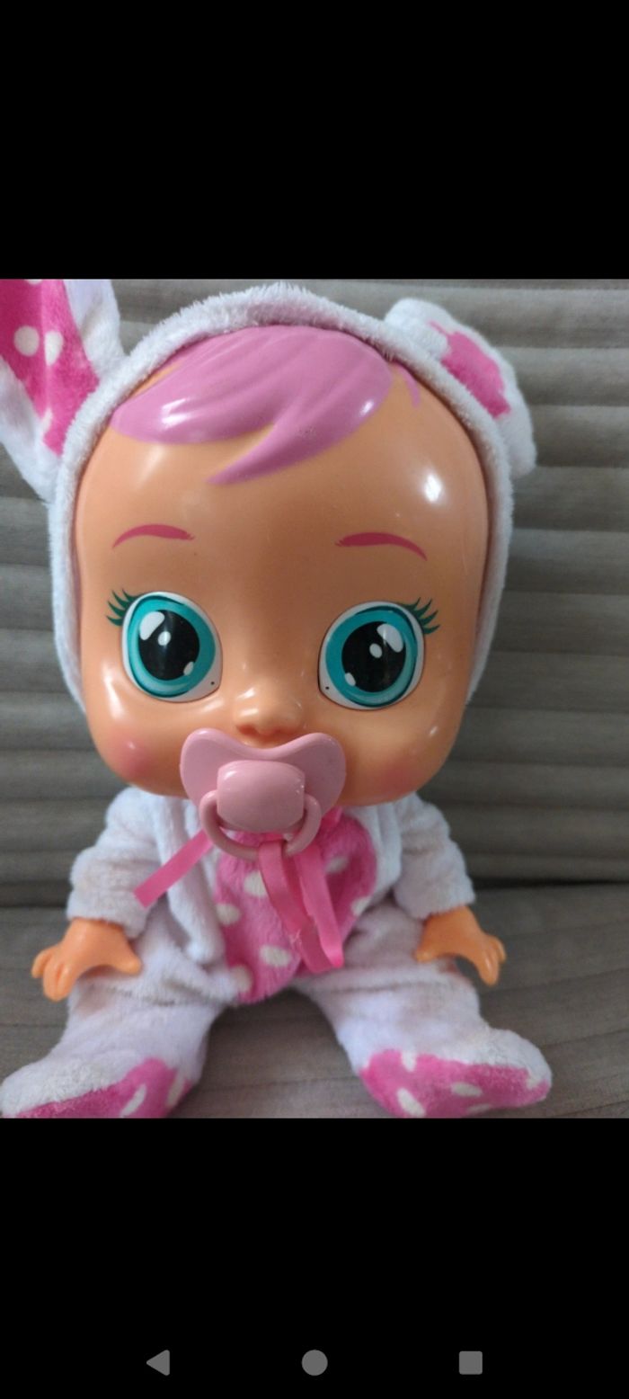 Poupon Cry babies. Modèle lapin. Avec sons, piles neuves incluses. Larmes d'un seul côté, l'autre ne fonctionne plus. Attention, il faut attendre un moment avant que les larmes ne coulent. A été testé avant mise en vente. Bon état général.