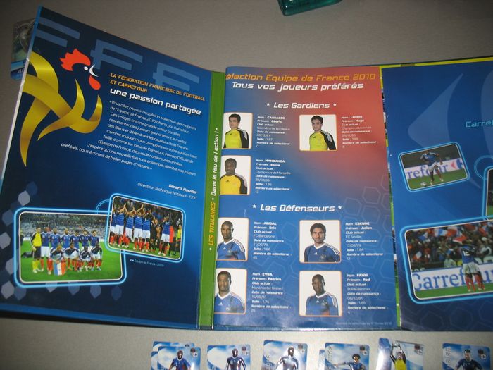 #Collections_Nathg2210 COLLECTION : ALBUM + MAGNETS FOOT "TOUS DERRIÈRE L'ÉQUIPE DE FRANCE" - 2010 - NEUF - n°20 Lot de : - 1 album magnétique pour ranger les magnets. - 19 magnets sur les 23 : Joueurs de foot. Je rajoute un album avec 16 magnets. Article Neuf – Le tout est rangé dans une boite hermétique. Possibilité d'envoyer d'autres photos sur simple demande. Maison non-fumeur - Sans animaux. Réduction lot activée. Allez voir mes autres ventes, je vide les placards. Beaucoup de vêtements de marque et beaucoup de jouets. Remise en mains propres ou possibilité d'envoi au tarif en vigueur à votre charge. Retour Refusé. Pour tout renseignement, n'hésitez pas à me contacter, je répondrai volontiers à vos questions. Réponse Assurée. Pour Consulter mes autres annonces tapez Nathg2210.