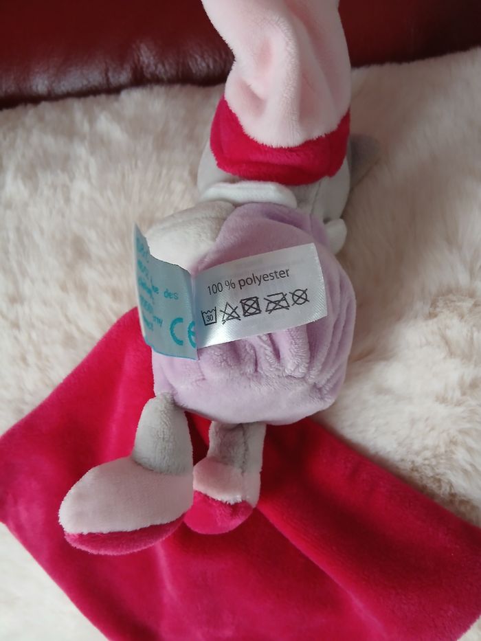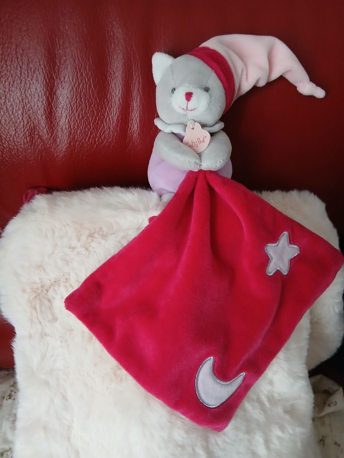 Doudou-Peluche marque Baby Nat. Chaton entièrement rembourré; yeux et museau brodés; bonnet non amovible; mouchoir brodé et cousu aux pattes. Hauteur Chaton de 16 cm. Ensemble lavable à 30° // voir photos pour détails