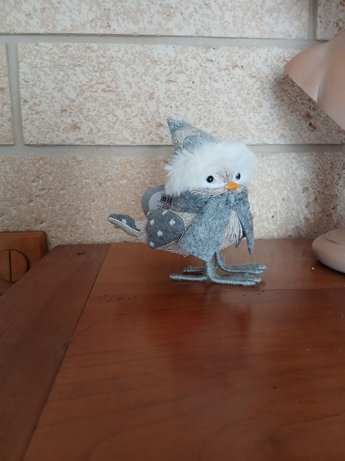 Article Neuf, encore étiqueté. Figurine décorative ( ce n'est pas un jouet) Petit Oiseau : corps en tissu frangé synthétique ; ailes et queue en tissu rembourré; écharpe en tissu ; yeux et bec en plastique dur;bonnet en tissu feutré brodé; bord du bonnet en tissu peluche; pâtes en métal recouvert de laine. Hauteur totale de 13 cm // voir photos pour détails