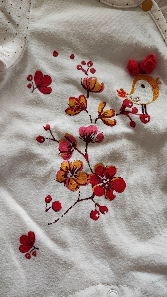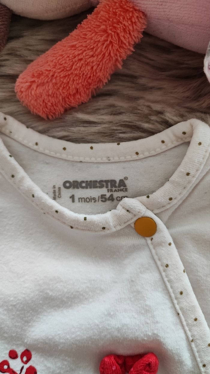 Pyjama blanc , oiseau rouge avec sur le devant. De la marque orchestra En taille 1 mois Un peu bouloché #laetitia33700filleunmois
