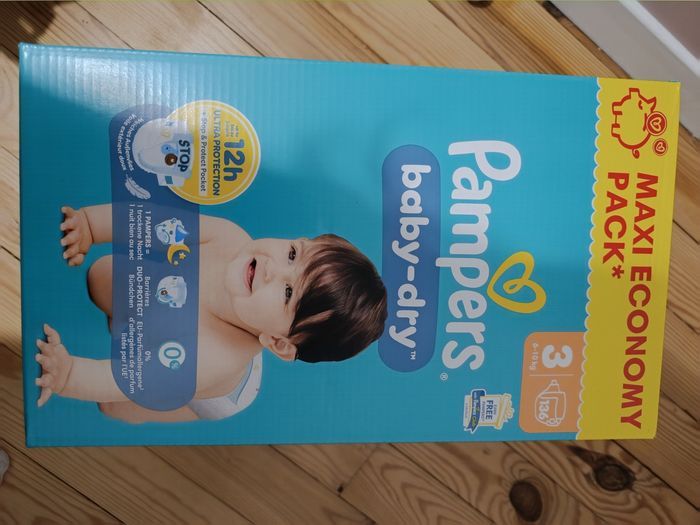 136 couches Pampers baby-dry taille 3, enfants 6 à 10kg, neuves, carton jamais ouvert. D'autres cartons de couches Pampers à vendre.