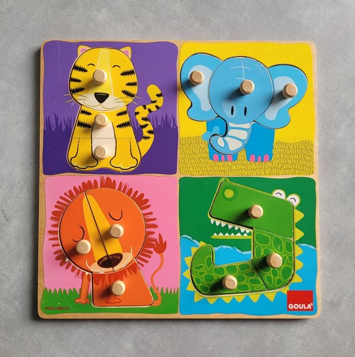 Puzzle animaux en bois, de la marque Goula, en très bon état. Article nettoyé pour la vente.