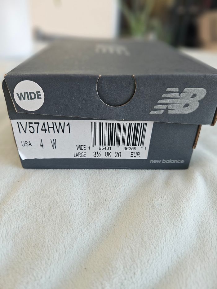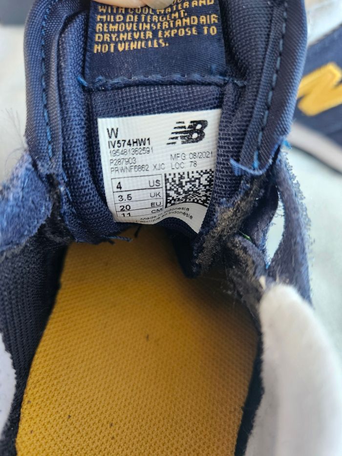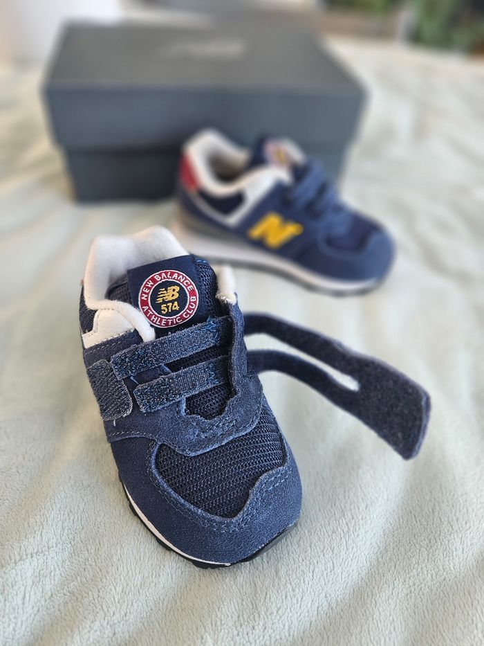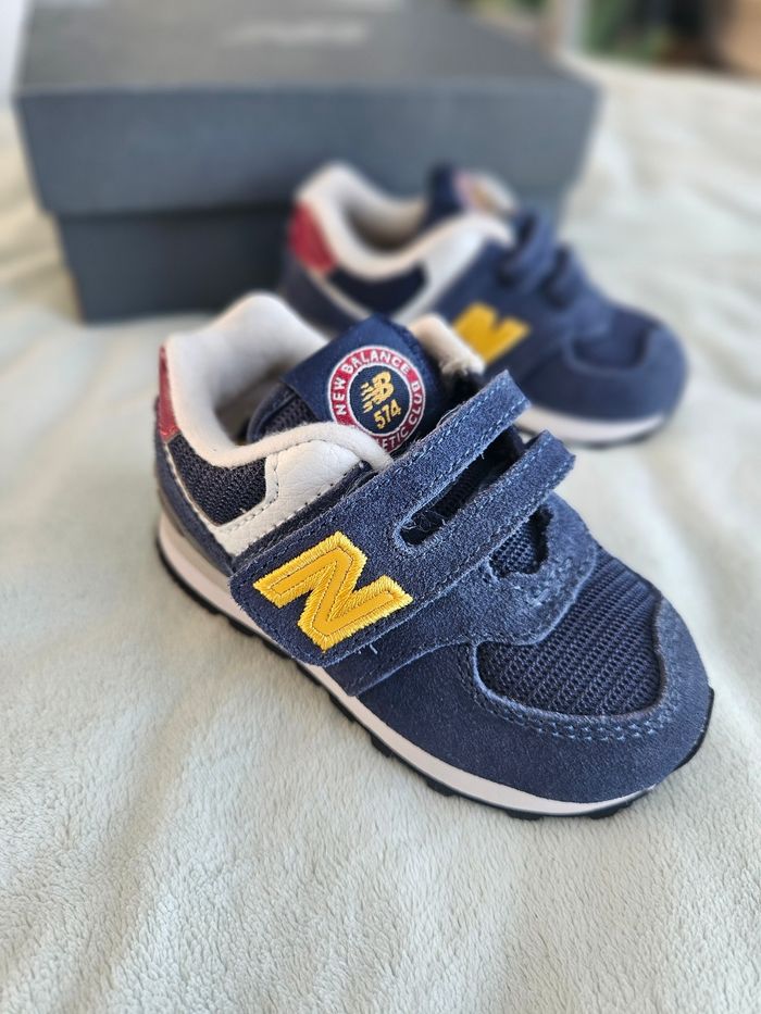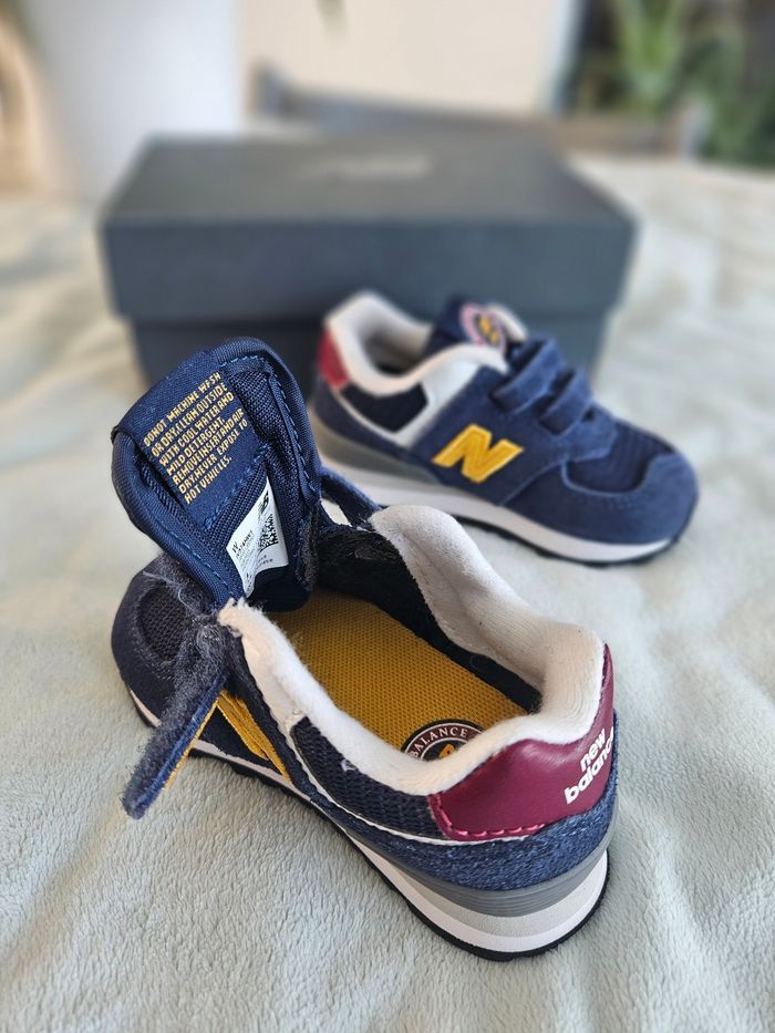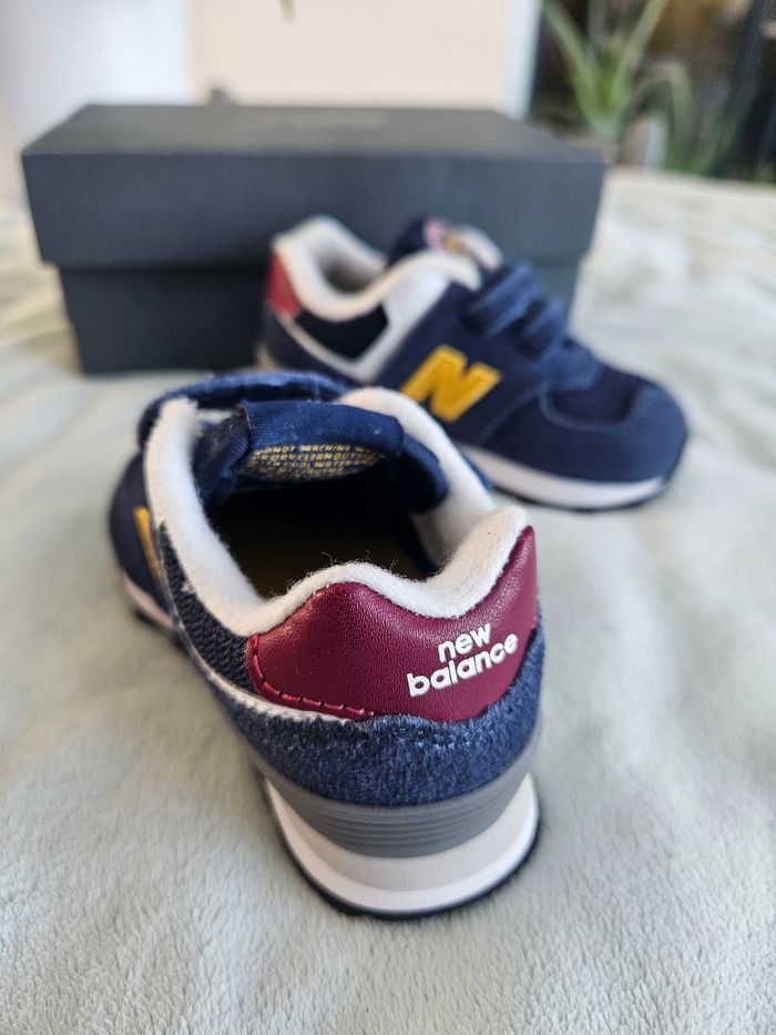 Je vends cette paire de baskets New Balance pour enfant. Jamais mise - Pointure : 20 - Couleur : Bleu marine et jaune - Matière : Textile et daim