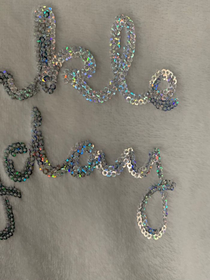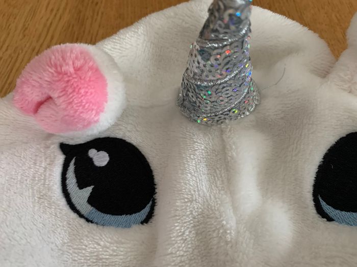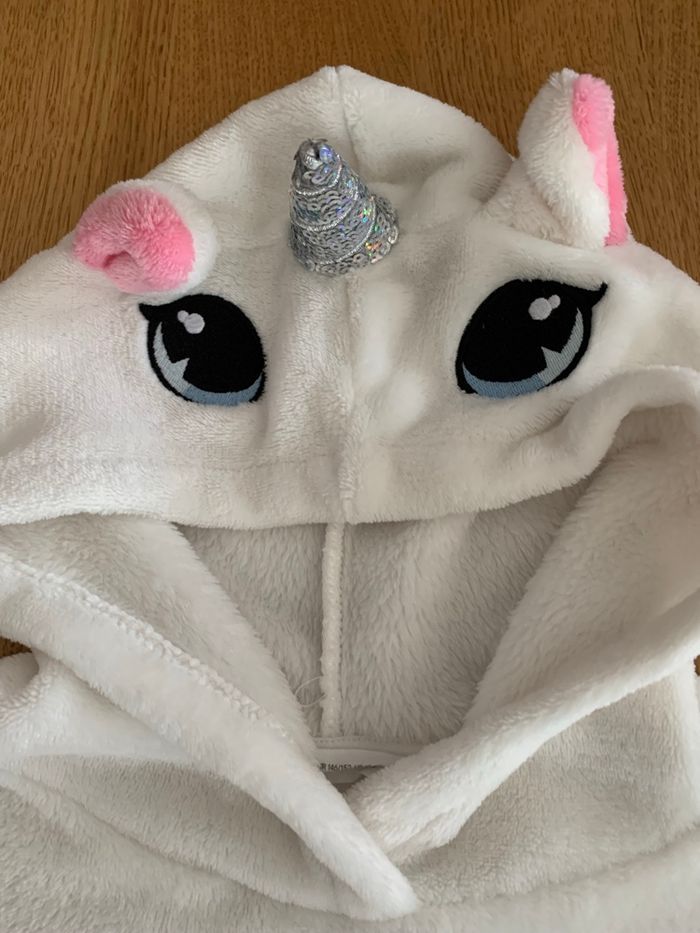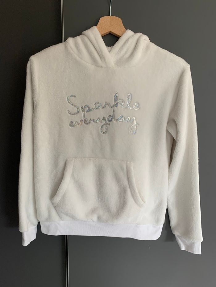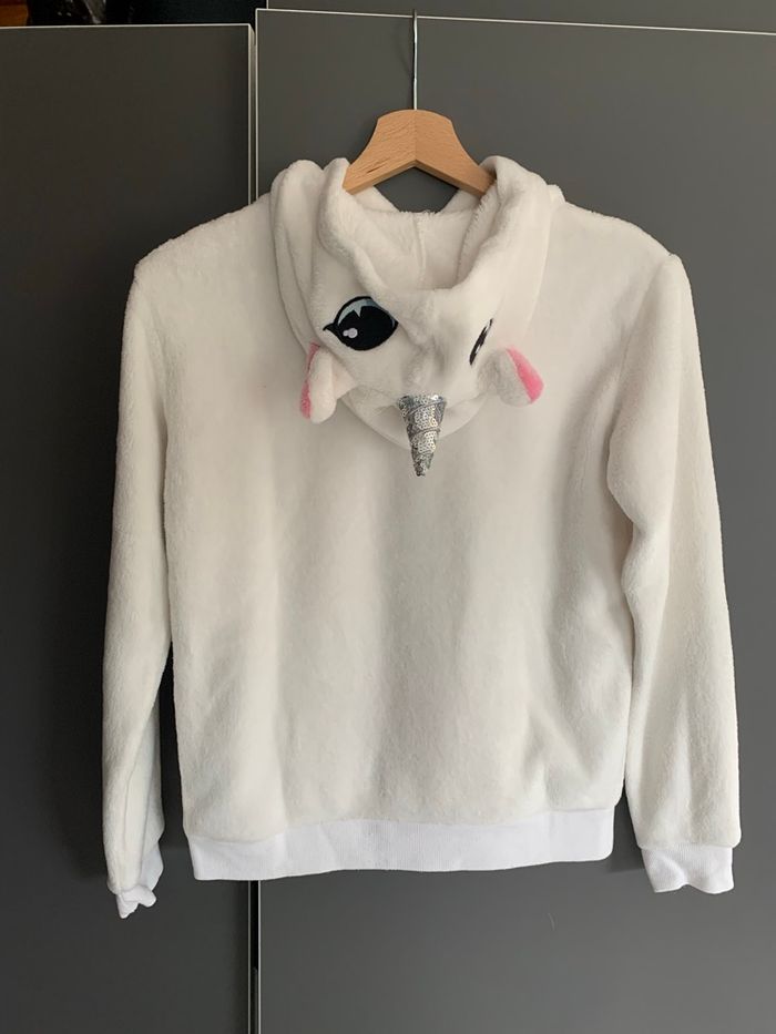 Sweat H&M avec capuche licorne tout doux et moelleux, poche kangourou, corne + inscription en sequins couleurs argenté, Taille 10-12 ans (146-152 cm), porté 1 fois, État proche du Neuf