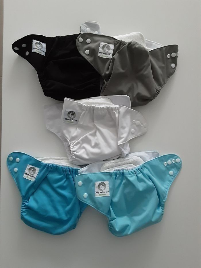 5 Couches culottes lavables évolutives TE1 de 3 à 15 kgs. Très peu servies. Pas de tâches. Très bon état. Marque Maman & BB nature.