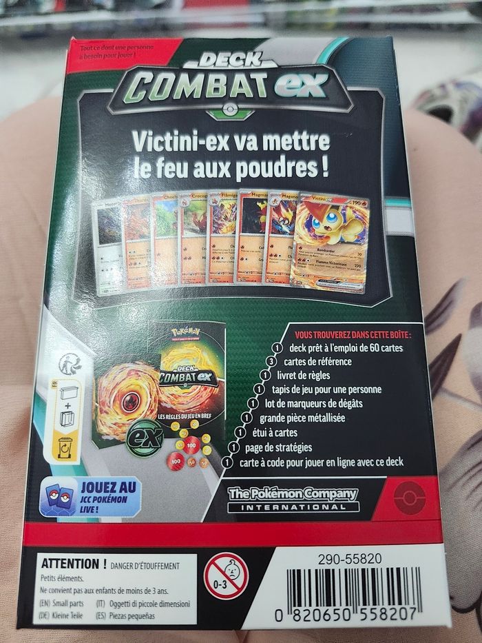 Neuf . N’hésitez pas à faire des lots. Pokémon - Jeu de cartes à collectionner - Victini-EX - Deck de combat Le deck de combat Victini-EX du jeu de cartes à collectionner Pokémon contient : - 1 deck immédiatement jouable de 60 cartes - 3 cartes de référence - 1 livret de règles - 1 support de jeu pour 1 joueur - 1 jeu de jetons de dégâts - 1 grande pièce de monnaie - 1 boîte de deck - 1 guide de stratégie - 1 carte de code pour jouer en ligne avecdeck Recommandation d'âge du fabricant : convient aux enfants à partir de 6 ans !