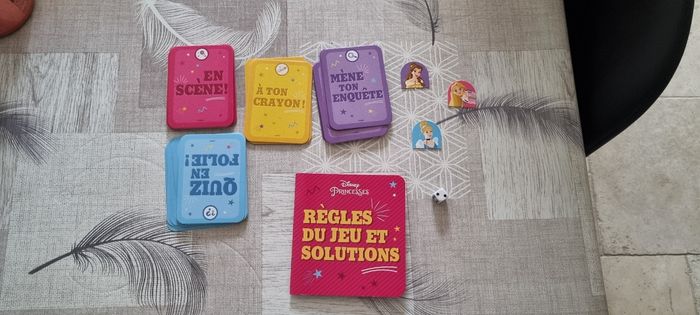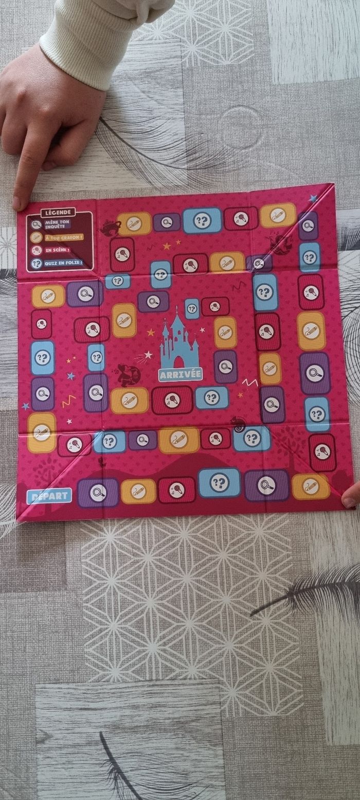Amusez-vous à tester vos connaissances sur l'univers des princesses avec cette petite boîte de quiz et défis pour toute la famille. Il vous faudra dessiner, mimer, deviner et vous mettre en scène ! Grâce à la boîte qui se transforme en plateau de jeu, on peut jouer partout : dans les transports, avant le dîner, à un goûter d'anniversaire... Contient : 1 plateau de jeu, 60 cartes, 1 dé, 4 pions avec supports, 1 livret des réponses.