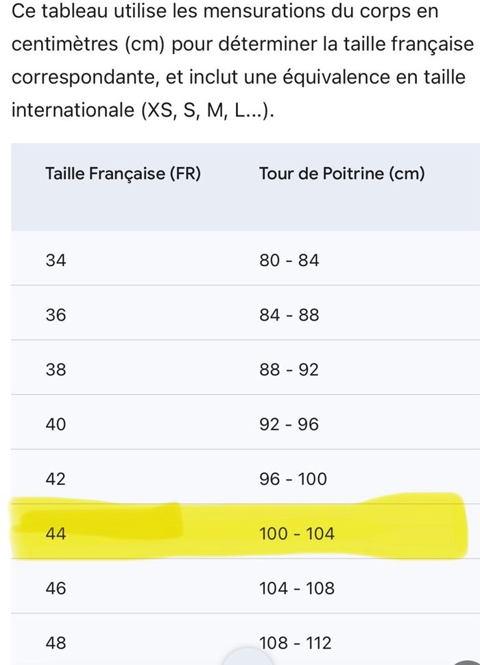 Il est noté sur l’étiquette taille 5 ce qui correspond selon deux guides de l’IA,à du 44/2XL.