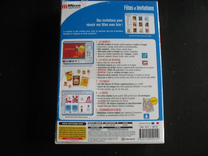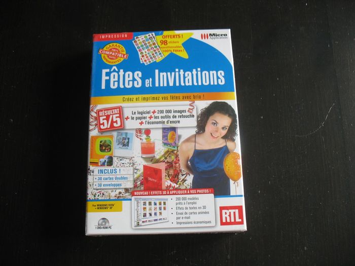 #Informatique_Nathg2210 CD ROOM : FÊTES ET INVITATIONS "MICRO APPLICATION" - NEUF - n°02 Cd room pour créer et imprimer vos fêtes avec brio. Le logiciel + 200000 images + le papier + les outils de retouche + l'économie d'encre - Inclus 30 cartes doubles + 30 enveloppes. Compatible Windows vista + Windows Sp Article neuf sous blister. Possibilité d'envoyer d'autres photos sur simple demande. Maison non-fumeur - Sans animaux. Réduction lot activée. Allez voir mes autres ventes, je vide les placards. Beaucoup de vêtements de marque et beaucoup de jouets. Remise en mains propres ou possibilité d'envoi au tarif en vigueur à votre charge. Retour Refusé. Pour tout renseignement, n'hésitez pas à me contacter, je répondrai volontiers à vos questions. Réponse Assurée. Pour Consulter mes autres annonces tapez Nathg2210.