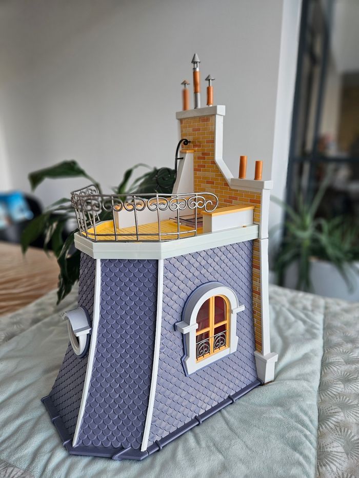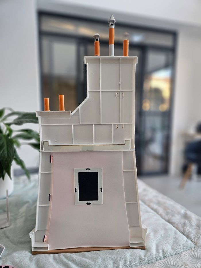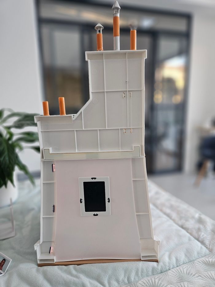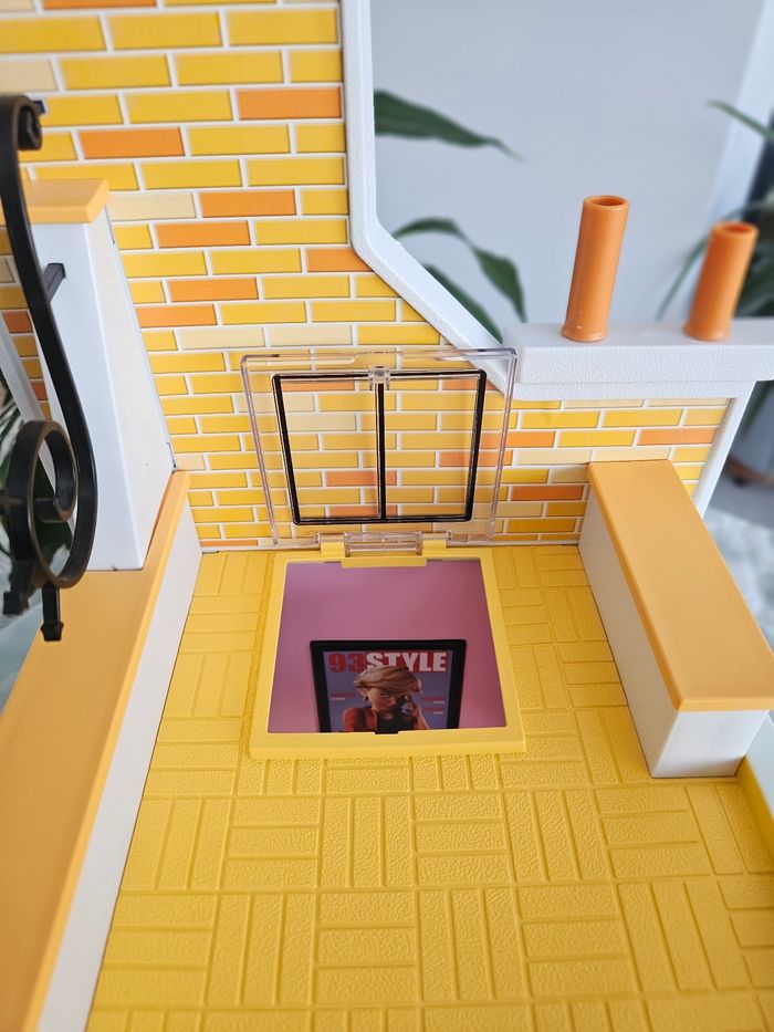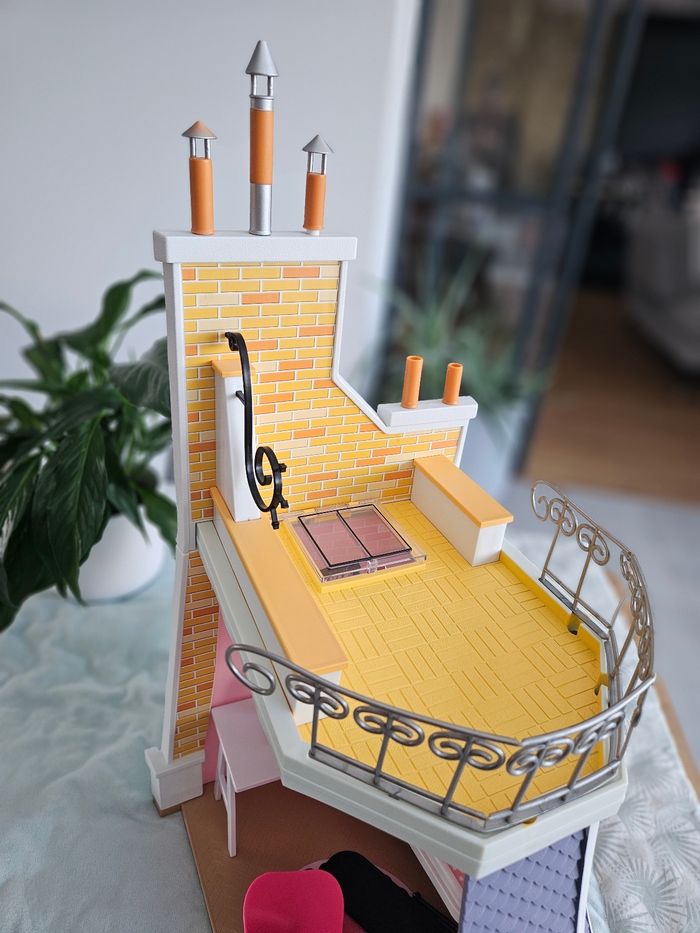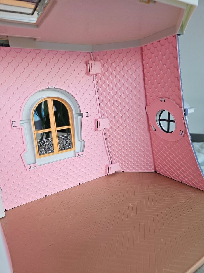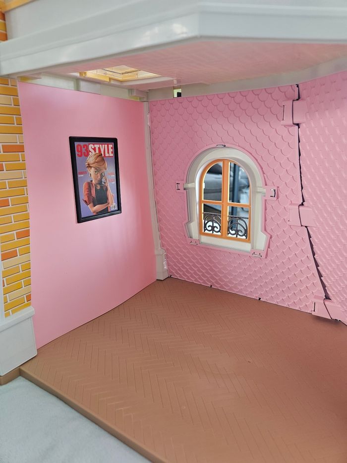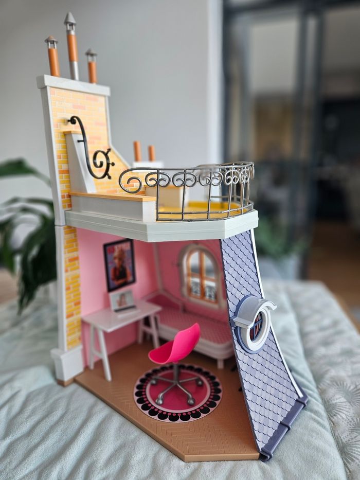 Décoration détaillée avec fenêtres, cheminée et accessoires: lit, tapis, chaise, bureau, ordinateur, miroir 60 cm de haut Compatible avec les poupées de 26 cm Très bon état.