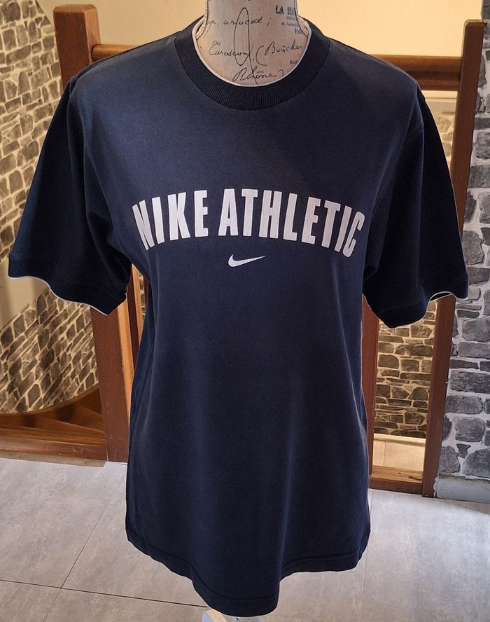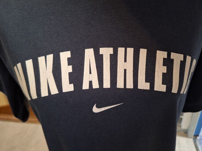 Tee-shirt Nike Athletic bleu marine avec col et bords des manches blancs qui contrastent. Imprimé devant un peu craquelé. 100 % coton.