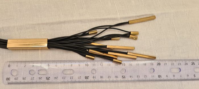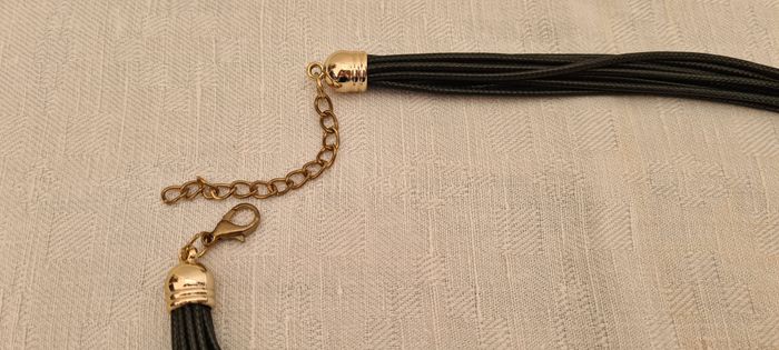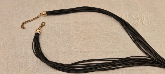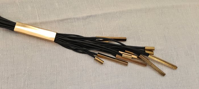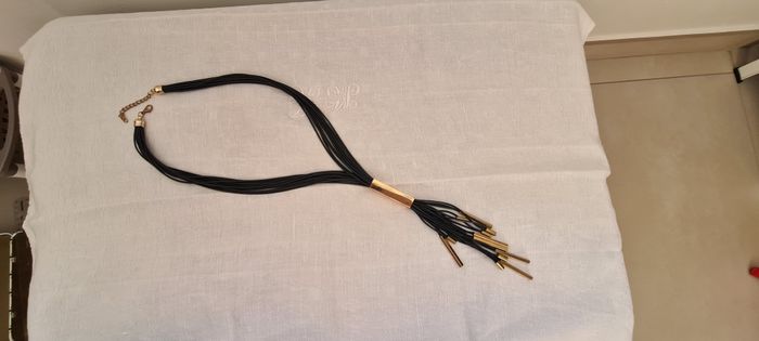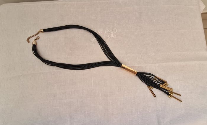Sautoir composé d'un groupe de 12 lacets noirs fins de chaque côte, retenus en haut par un fermoir doré en cloche. Chaque côté s'attache l'un à l'autre par un crochet doré style mousqueton sur une chaînette de 6 cm. Permet de régler la longueur. Ces groupes de lacets sont rassemblés dans une pièce dorée rectangulaire de 5 x 1 x 1 cm. Ils en ressortent en franges de longueurs différentes (entre 6.5 et 16 cm), rassemblées 2 par 2 par des petits cylindres dorés de 1 cm de long, ou des tubes rectangulaires de 4 x 0.4 x 0.4 cm Longueur totale 50 cm. Peu porté reste en très bon état #sautoirnoiretdoré #collierliensnoirs #cubesdorés #bijoufantaisie #mar-taybijoux