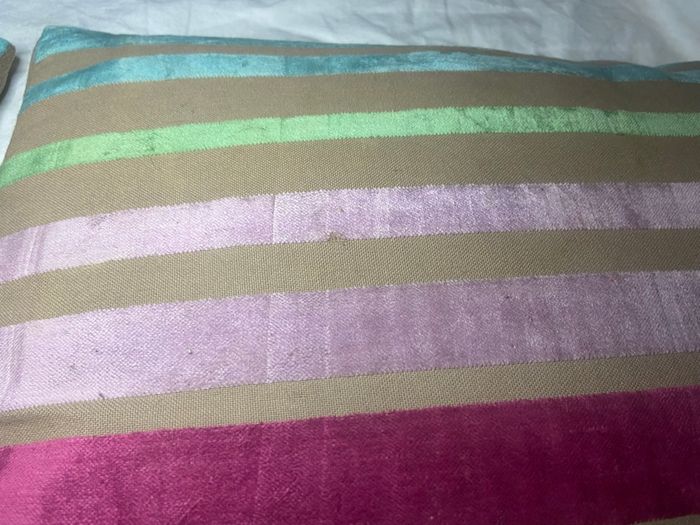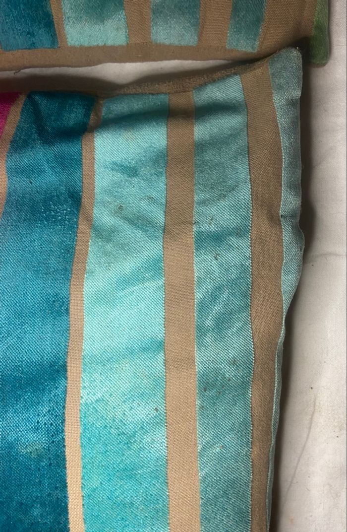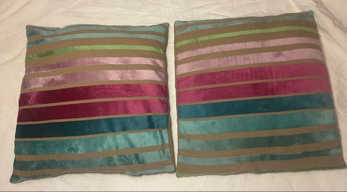 Coussins rayés multicolores. A signaler,petites traces sur les 2 très discrètes(voir photos)sinon en bon état. Si vous avez le moindre doute, n’hésitez pas avant achat de me demander les mesures ou renseignements, pour éviter tous désagréments. 🔥🔥Réduction sur les lots activée🔥🔥 -5% de remise pour 2 articles. -10% de remise pour 3 articles. -20% de remise pour 5 articles.