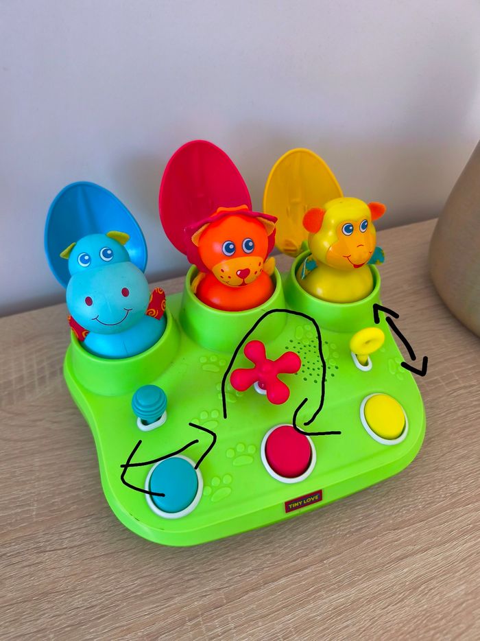 Puis quand bébé grandit, il peut faire bouger l'animal en actionnant la forme (tourner/ devant-derriere, droite-gauche)