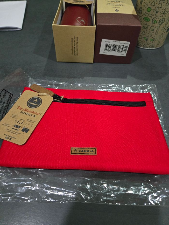Neuve avec étiquettes pochette rouge cabaïa. Designs français, entreprise certifiée b-corp. J’ai en vente dans mon dressing un bonnet avec ses 3 pompons et une gourde #nathalie5411