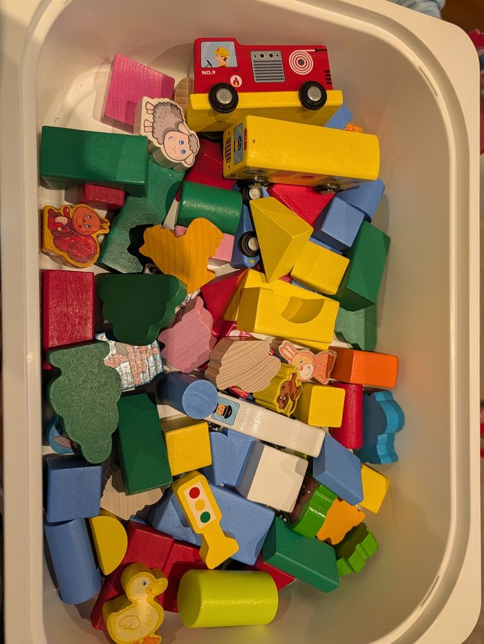 Vends lot de jeux en bois Jeu de construction avec véhicules et animaux en bois Très bon état