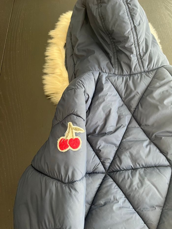 Manteau chaud Bleu marine Cerise sur l’un des bras La fourrure au niveau de la capuche peut s’enlever. A été porté par 2 enfants, mais est en très bon état