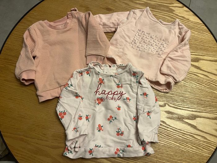 - 1 pull marque verbaudet. Rose clair avec motifs rouges et verts - 1 pull Kiabi. Rose clair - 1 pull Primark. Rose clair. Ils ont été porté mais sont en bon état.