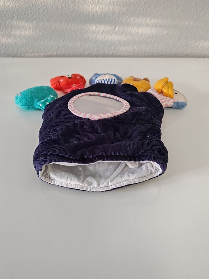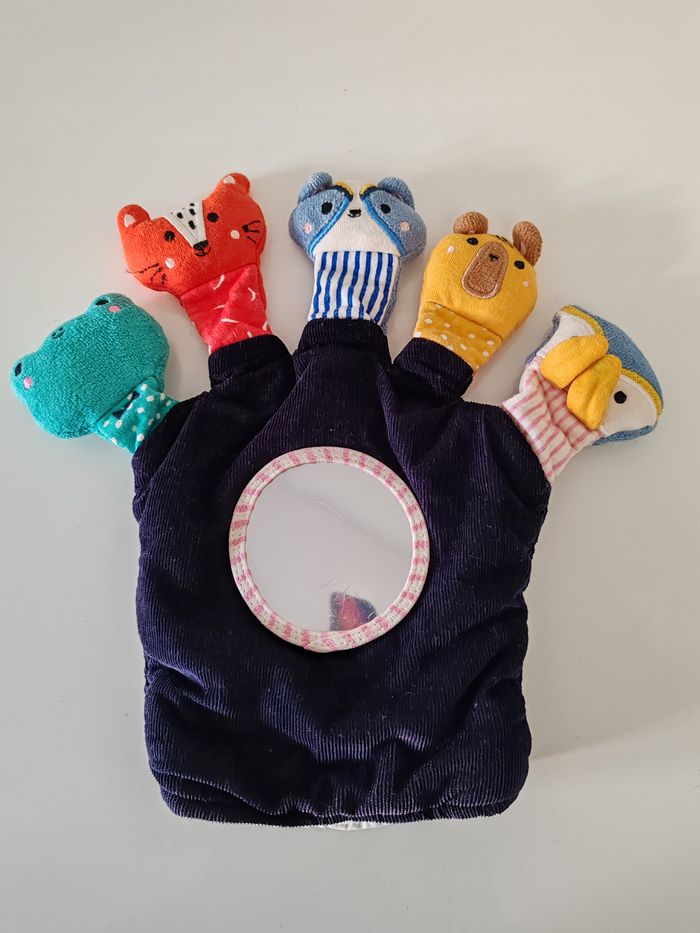Gant marionnettes de la marque NATURE & DECOUVERTES en excellent état 5 personnages pour inventer des histoires : la grenouille, le renard, le raton laveur, l'ours et la chouette. Ensemble, les 5 personnages accompagnent le moment de jeu ou le rituel du coucher pour imaginer de belles aventures. Le gant est fabriqué en coton bio. Il dévoile plusieurs matières, couleurs et un miroir pour stimuler bébé et accompagner son développement sensoriel.