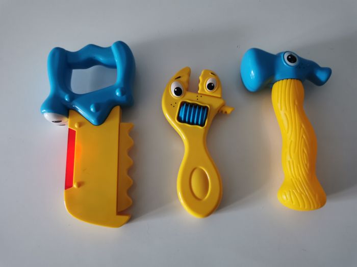 Kit d'outils jaune et bleu comprenant une scie musical et lumineuse, une pince et un marteau