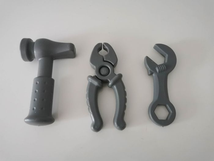 Kit d'outils en plastique gris comprenant un marteau, une pince et une clé