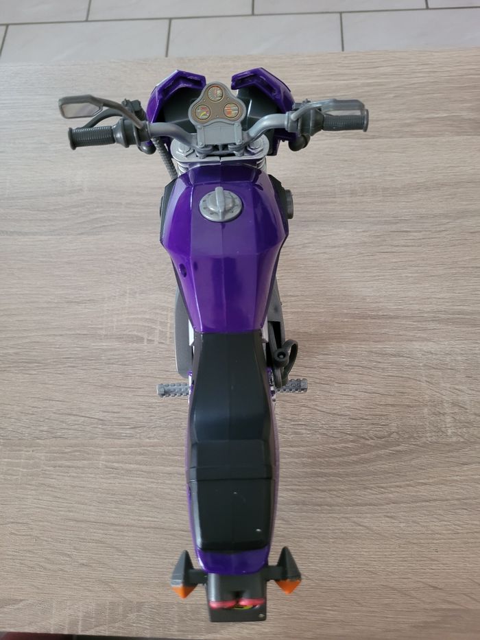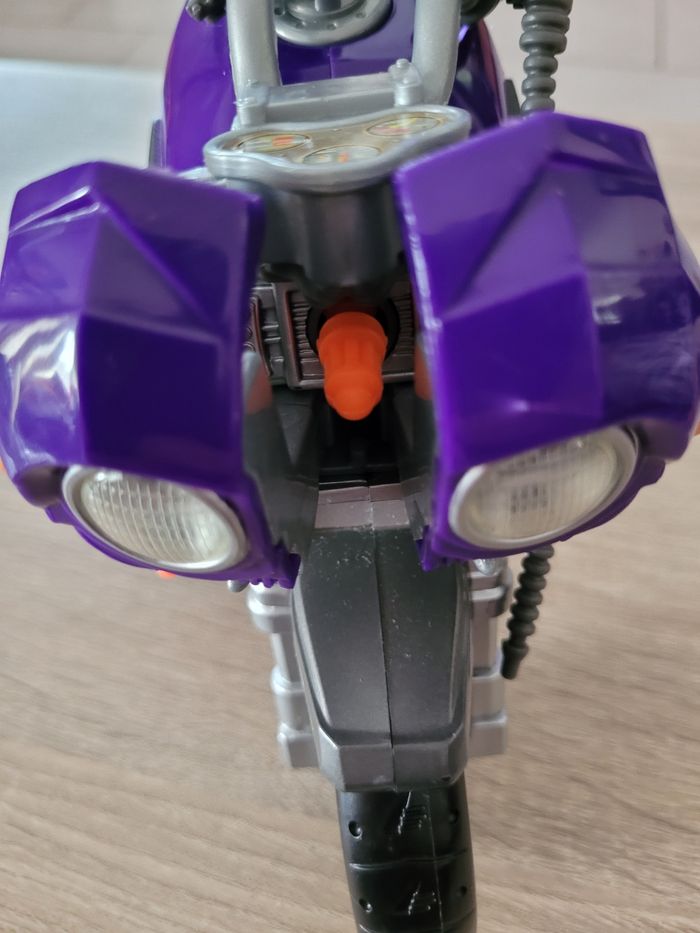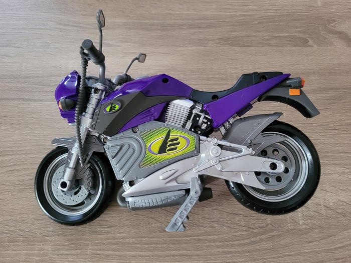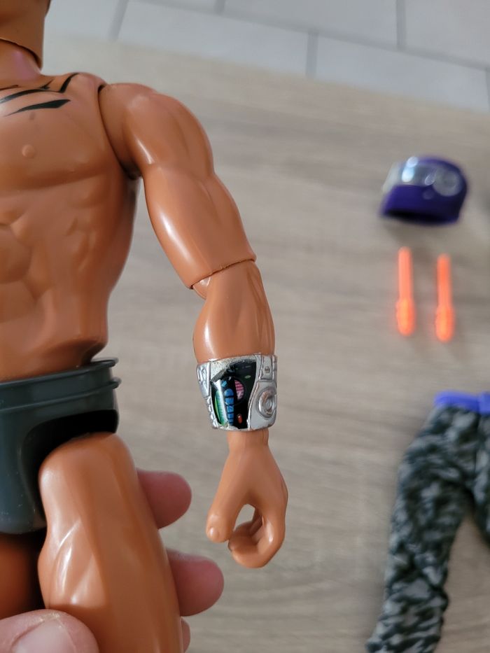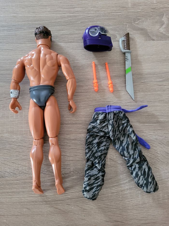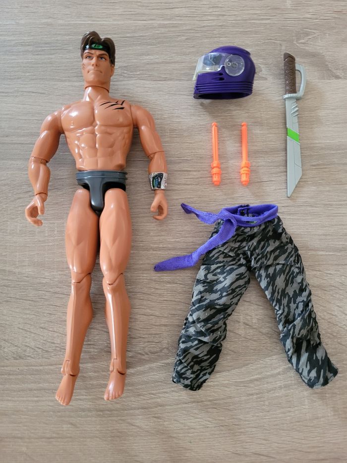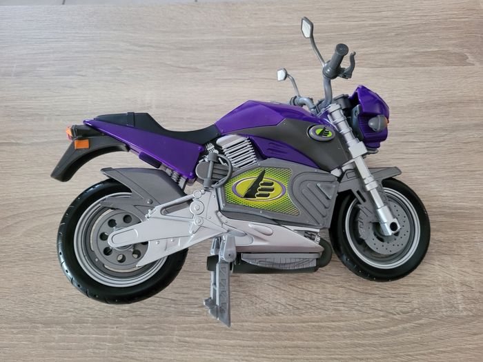 Vend figurine vintage Max Steel Panther Claw combat environ 30cm avec sa moto et accessoires, manque les chaussures. Date de 1998 pour la figurine et de 2000 pour la moto. Le mécanisme d'envoi du missile est fonctionnel avec le pied qui appuie avec un peu de difficulté. En bon état juste des signes d'usures liés au jeu et pantalon un peu abîmé (voir photos). Vendu tel que sur la publication.