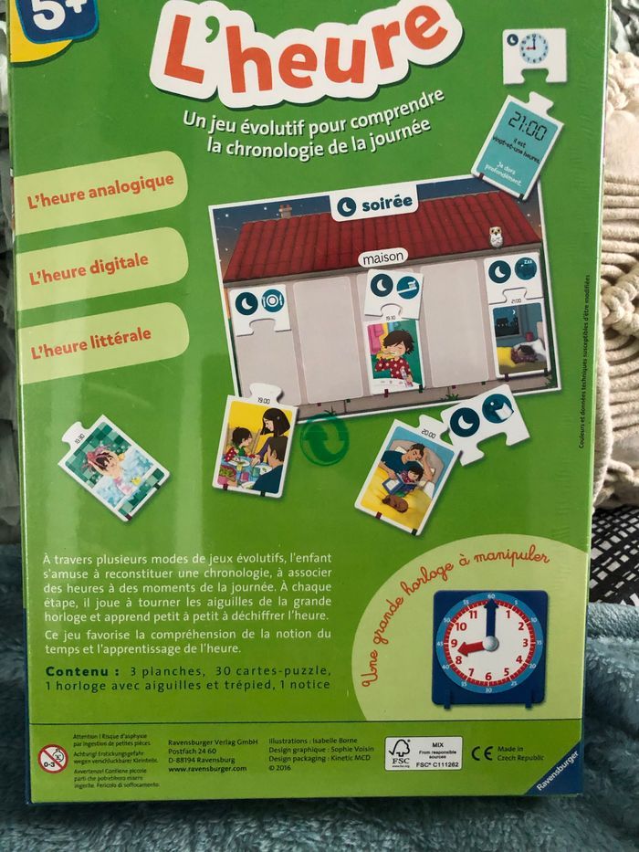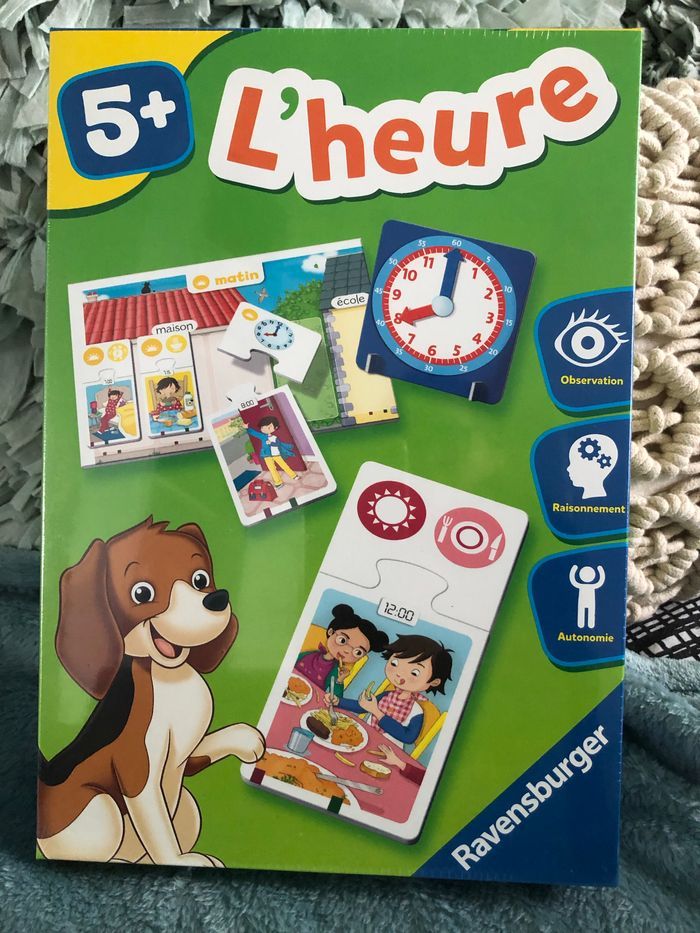 Bonjour, Je vends ce jeu l’apprends l’heure idéal pour les enfants de 5ans , apprendre en s’amusant , d’autres jeux j’apprends de ravensburger Envoi rapide en J+1 maxi