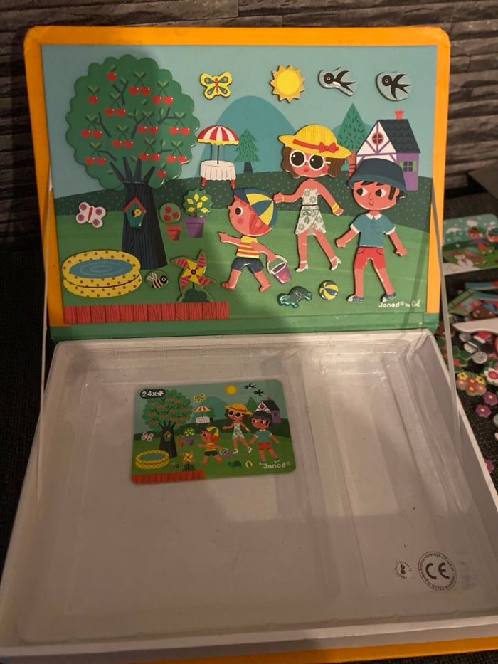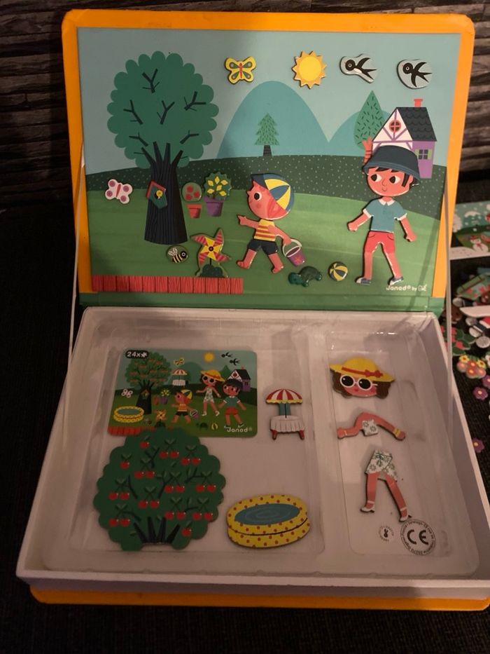 Il contient 4 cartes illustrées et 115 magnets, une fois le livre ouvert, le but du jeu est de recomposer la scène indiquée sur la carte à l'aide des magnets.