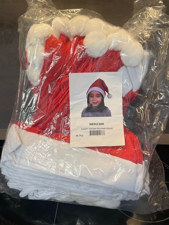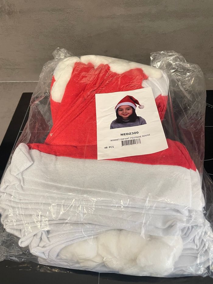 48 Bonnets de Noël neufs Pour enfant de 4 à 10ans 38 cm de haut et 26cm de large Vente au détail possible Le bonnet : 1.50€ Par 10 bonnets : 10€ soit 1€ le bonnet
