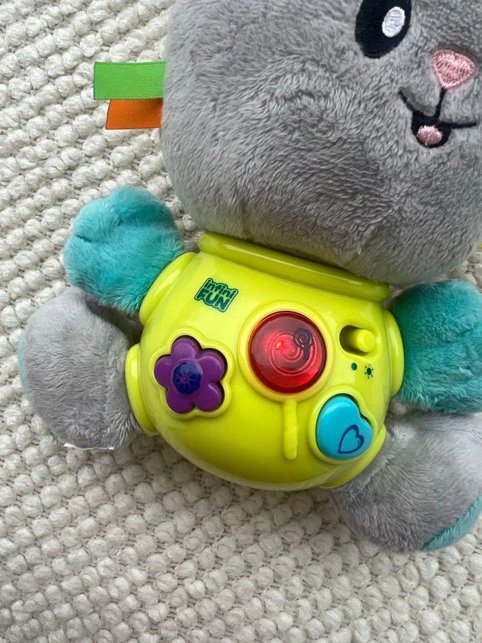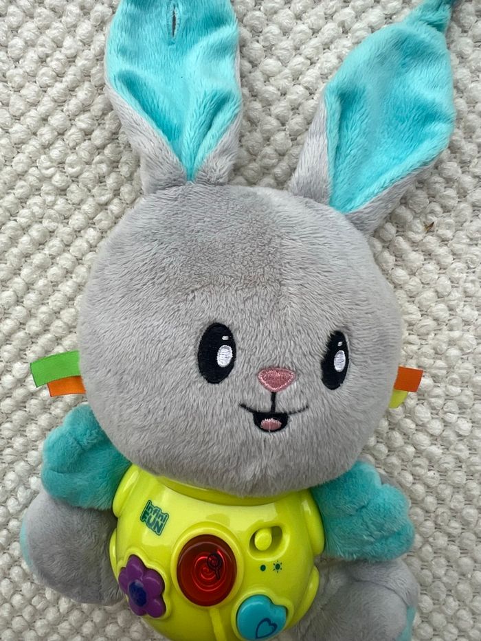 Ce joli doudou d'activités avec papier craquant et rubans éveillera les enfants des le plus jeune âge. Il est facile a accrocher au berceau, au parc, au siege auto, ou encore a la poussette grâce a ses oreilles qui se nouent entre elles! Les tout-petits apprécieront la douceur de cet adorable lapin. En appuyant sur les touches, l'enfant découvrira des mélodies qui stimuleront son acuité auditive et visuelle.