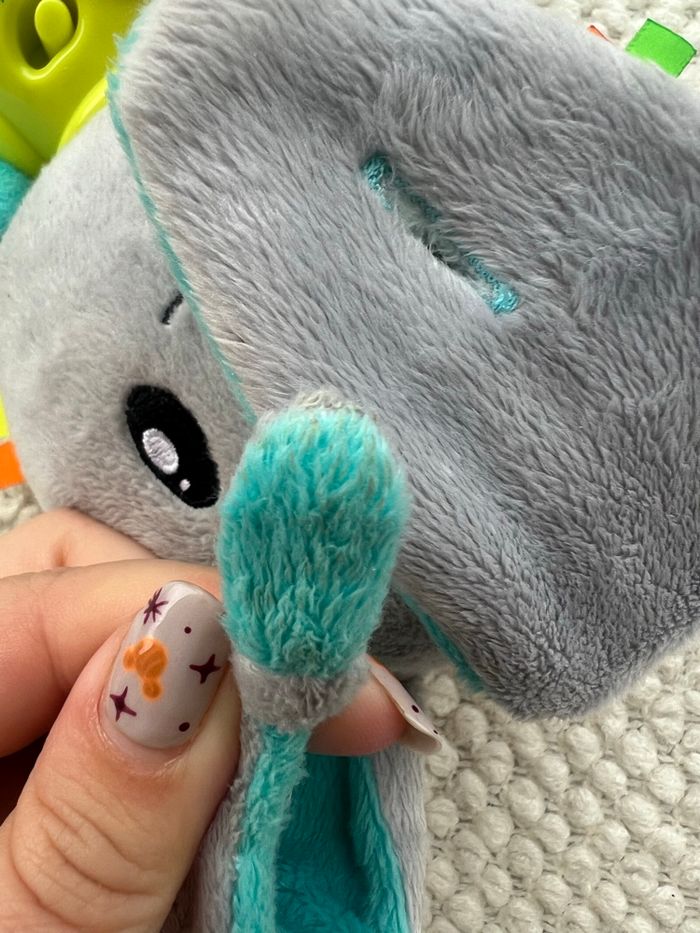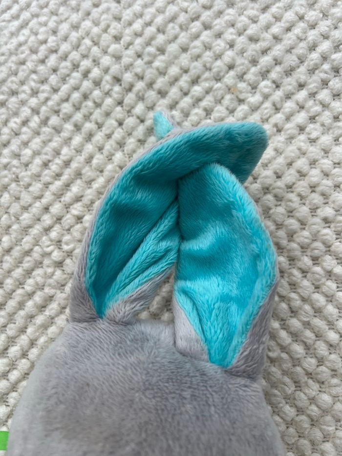 Les oreilles et le dessus de la tête du lapin ont été lavé car ont été en contact avec la bouche bébé. Il reste une petite tache au bout de l’oreille, je n’ai pas assez insisté au moment du lavage mais elle est propre
