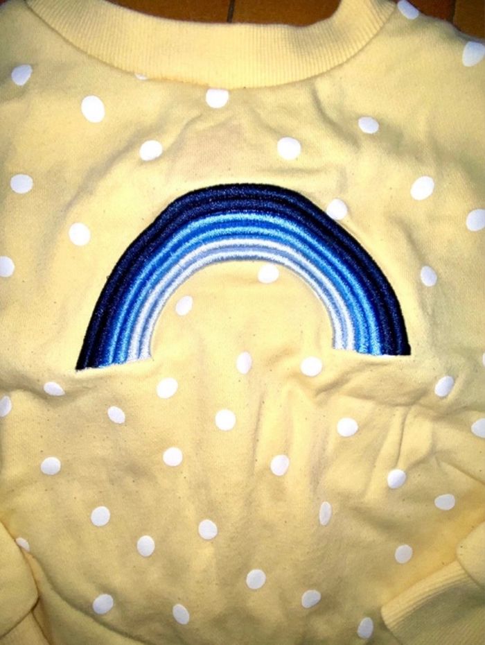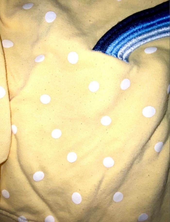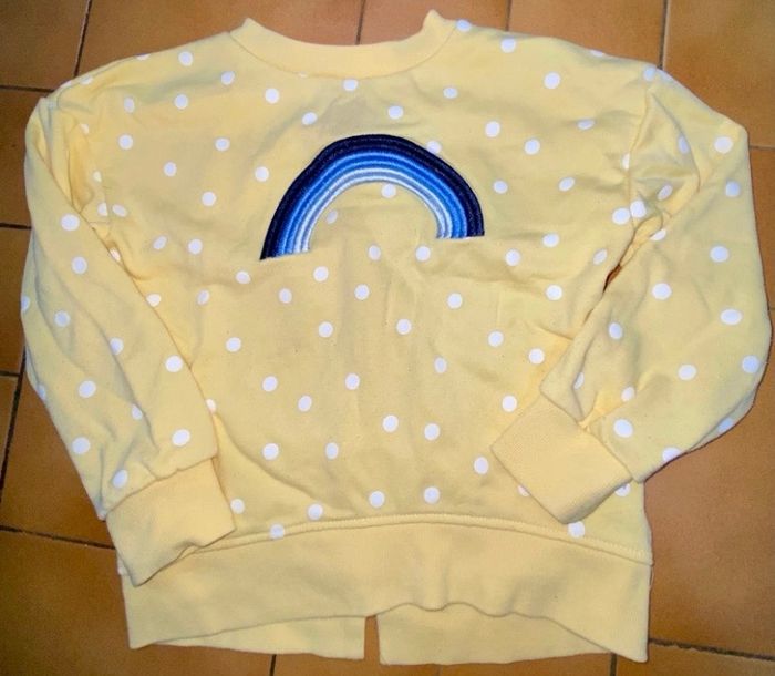 Sweat couleur jaune à pois blanc motif arc en ciel bleu