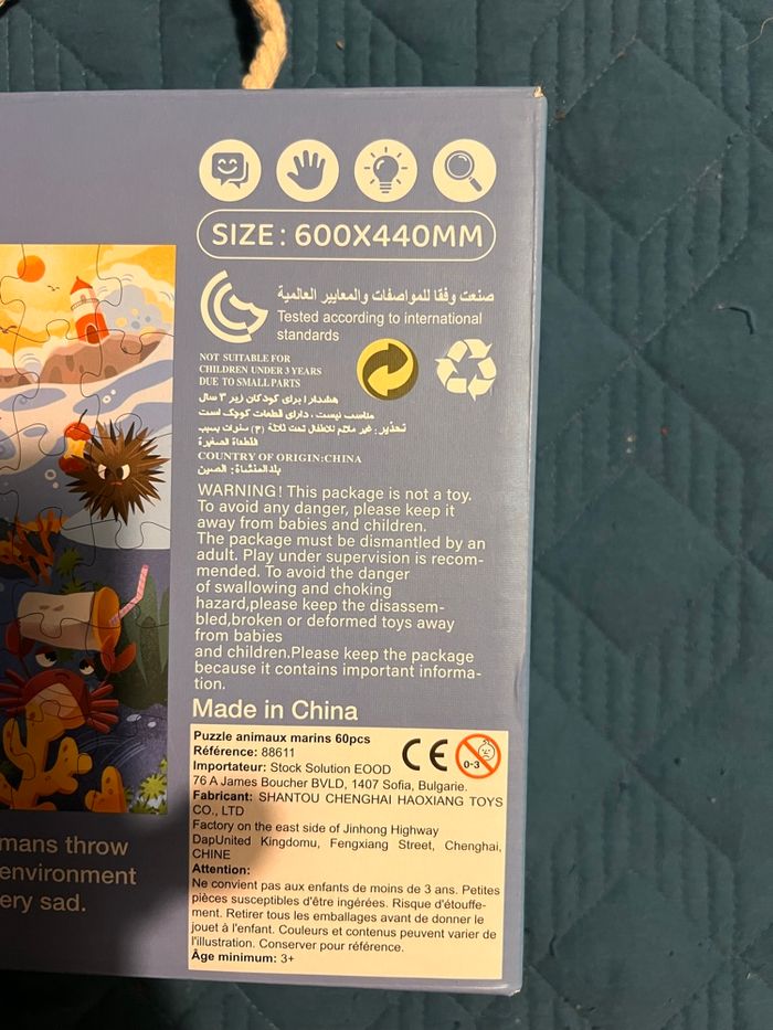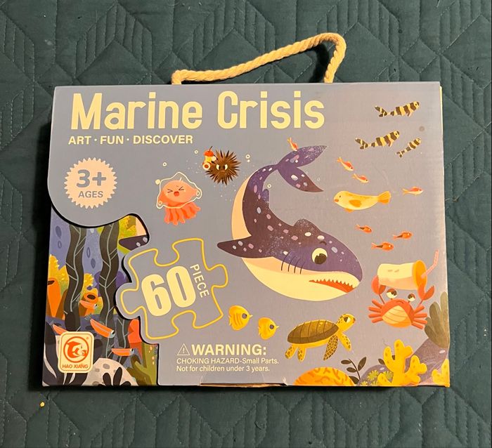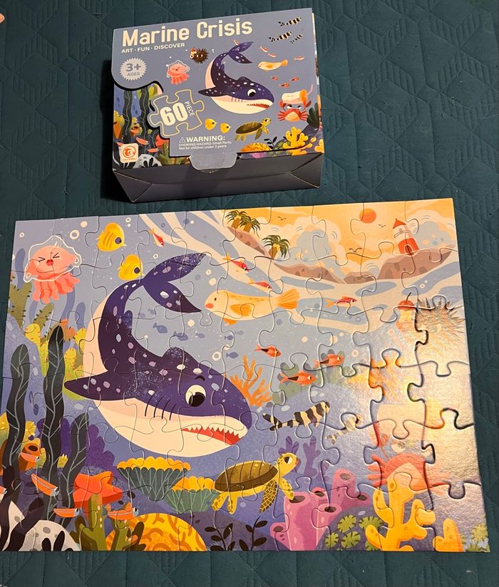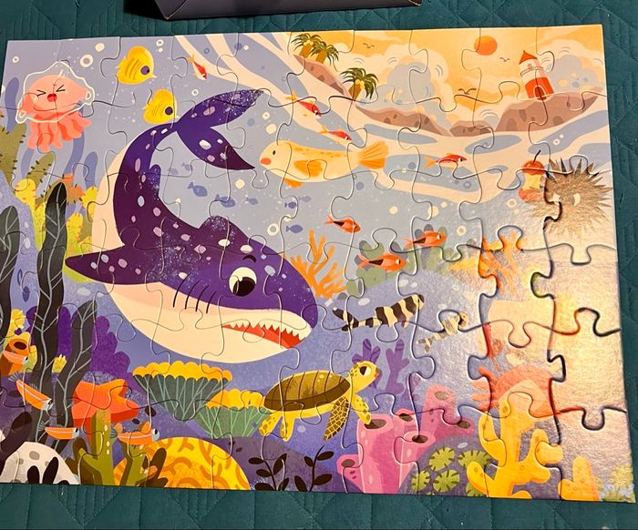 Nombre de pièces : 60 Dimensions : 60 cm x 44 cm Matériaux : carton épais, Thème : fond marin Conditionnement : boîte rigide avec poignée facile à transporter Favorise : développement de la logique, coordination œil-main, concentration