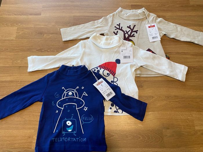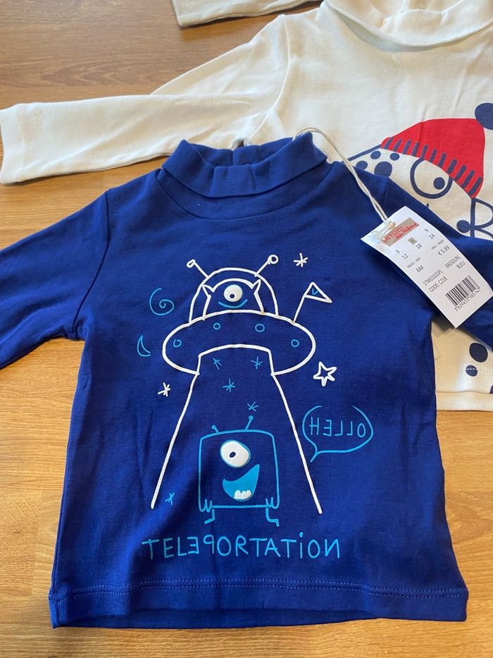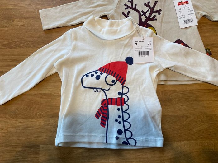 Tee shirts manches longues neufs DPAM Col roulé. Petits boutons à l’arrière du col pour pouvoir enfiler facilement. 2 en taille 6 mois 1 en taille 9 mois. (Dinosaure avec bonnet rouge)