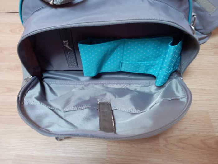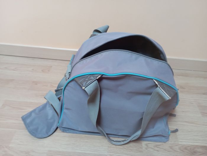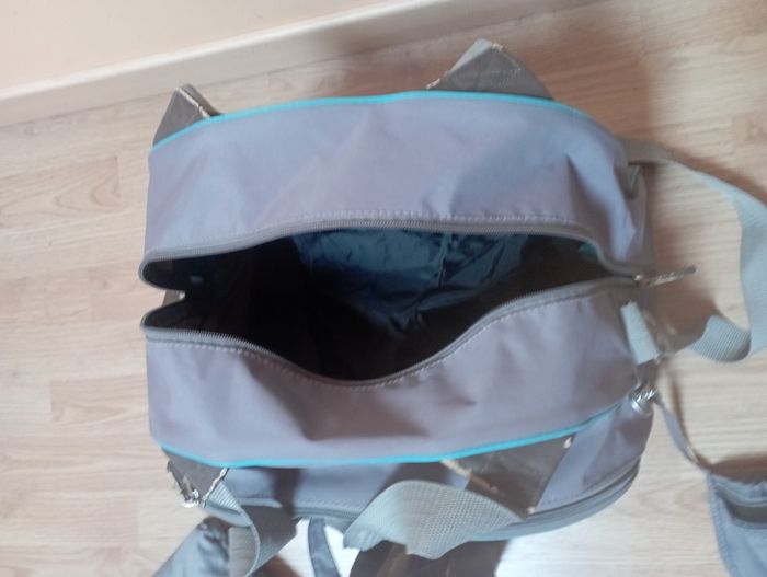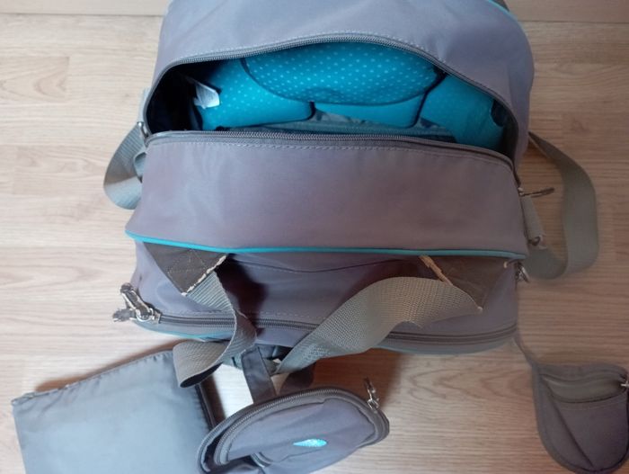 Vends sac à langer gris/turquoise avec nombreuses poches avec poches tétine , isotherme pour biberons ou bouteille d'eau.il dispose d'un tapis à langer et une housse pour en cas de pluie. Ce sac est fait pour les parents qui sont prêts à parer à toutes éventualités grâce à ses nombreux rangements.