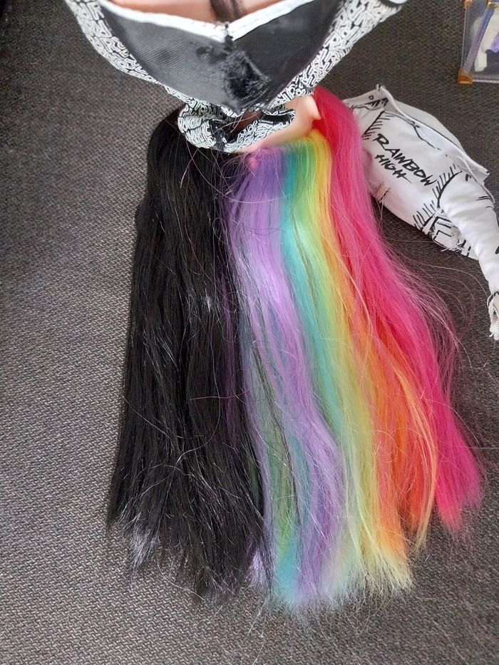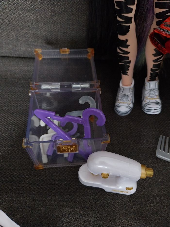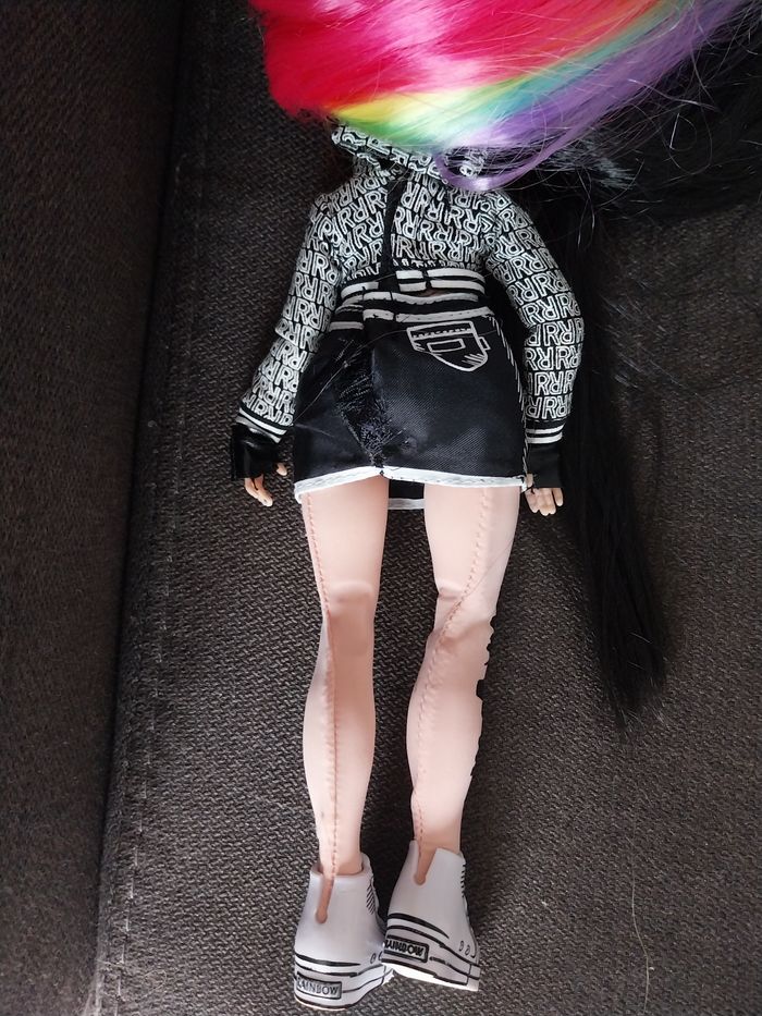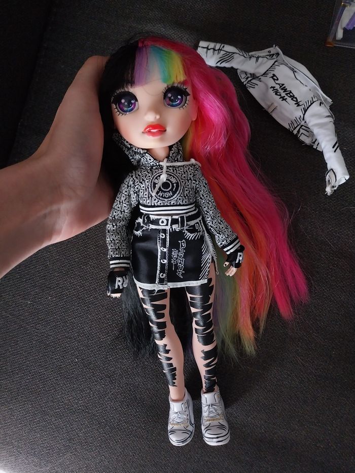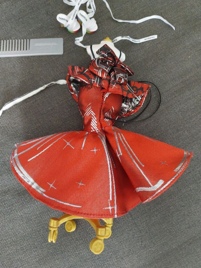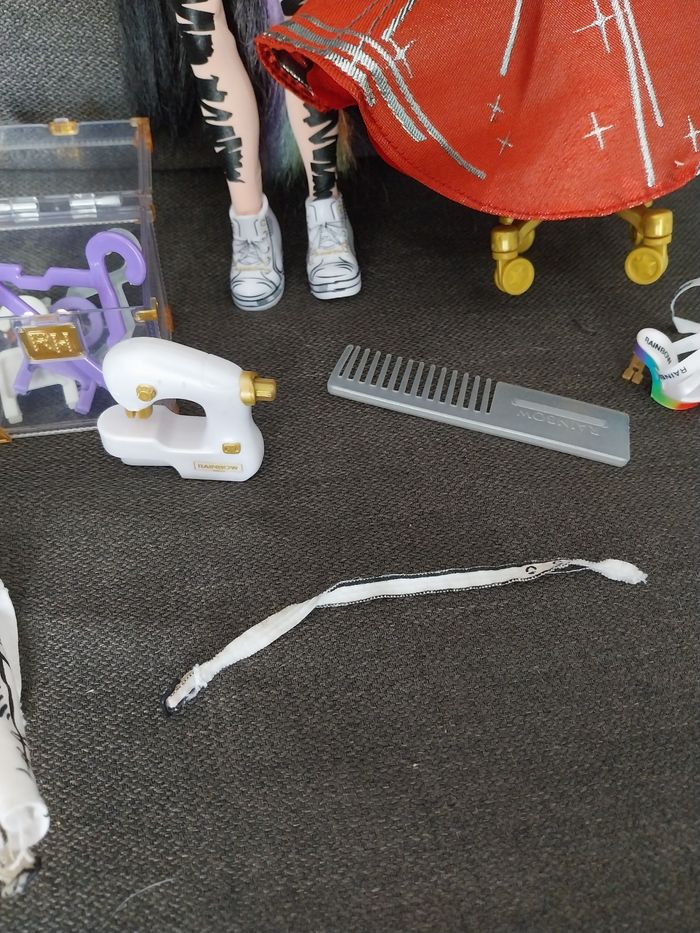 Non négociable, merci d'avance ♡ Envoi rapide et soigné sous 24/48h. Poupée de collection Rainbow High Jett Dawson. La poupée a des cheveux lisses et soyeux. Sa tenue d'origine est complète (attention cependant à l'arrière de la jupe noire, un peu décousue). Il y a également un portant avec sa robe rouge supplémentaire et ses chaussures arc-en-ciel. Un mètre ruban, une veste, une guitare, une brosse, une machine à couture, ainsi qu'une valisette avec des cintres. Très bon état général. L'ensemble est comme en photos, l'état également. Les accessoires sont tels quels. 58€